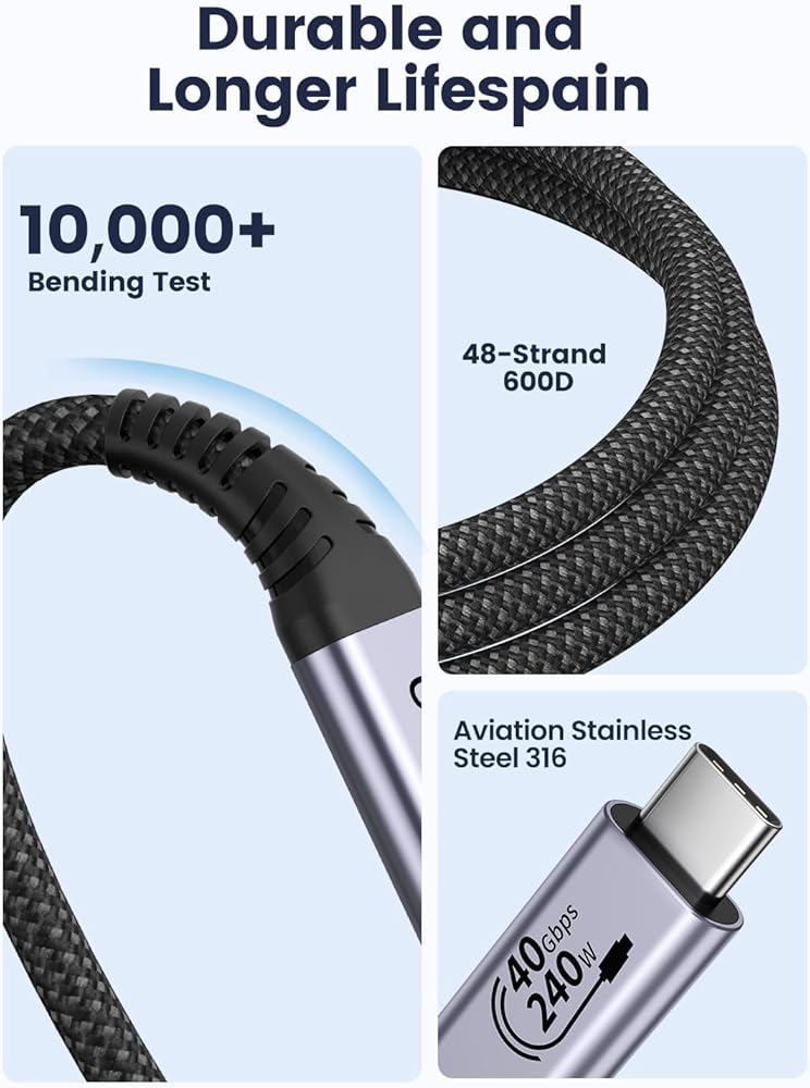【توافق واسع】 كابل USB 4 متوافق مع USB3.2 Gen2، USB3.1 Gen2، USB3.0، USB2.0، ويدعم وظيفة Thunderbolt 4/3، وهو مناسب لشاشة Apple Studio Display، Mac Studio، Macbook Pro /Air، وiMac، وiPad Pro، وSurface Laptop Studio، ومحطة إرساء Thunderbolt، وSSD، وeGPU، وبنك الطاقة، وشاحن GaN وأجهزة أخرى من النوع C.