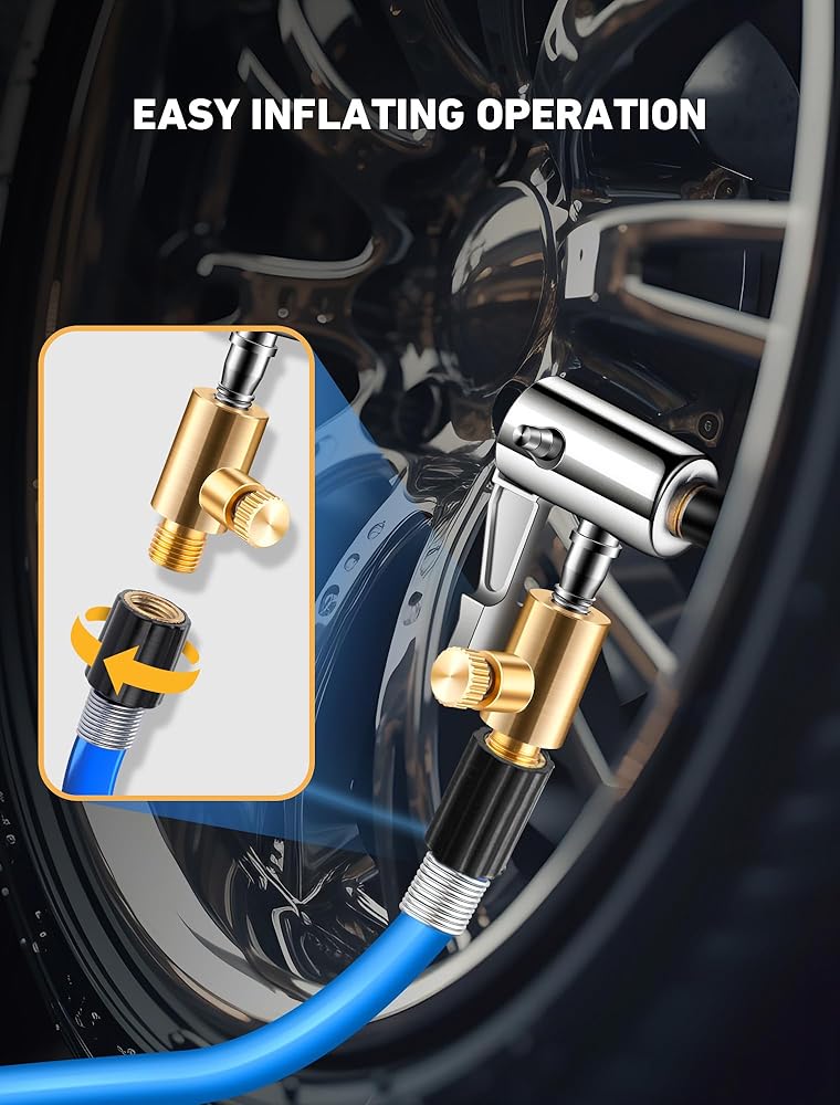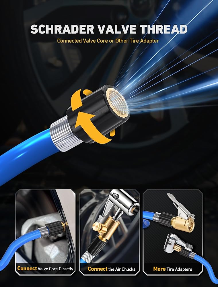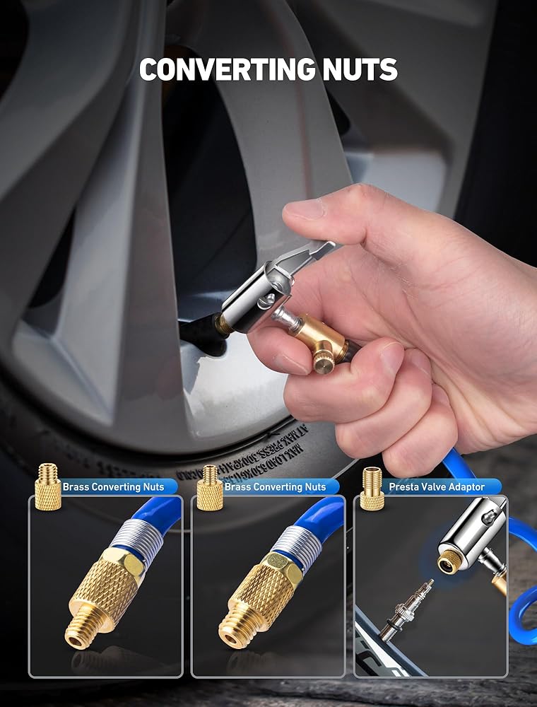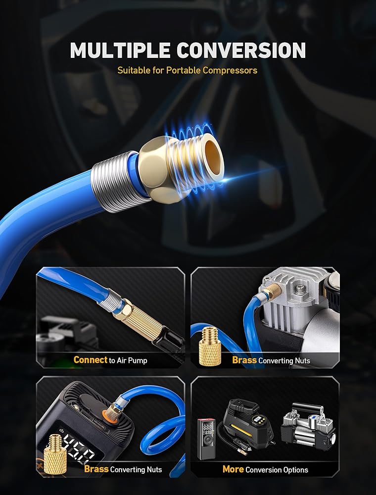💡【استخدام واسع】: مجموعة محول خرطوم نفخ الإطارات الممتازة مصممة لضاغط/مضخة هواء السيارة المحمولة الشائعة، ومضخة الدراجة الكهربائية، وتحويل وصلة نفخ الإطارات بسهولة إلى اتصال القفل. مناسب عالميًا لنفخ صمام شريدر لمعظم الدراجات والدراجات النارية والشاحنات السيارة وملء هواء السيارة وما إلى ذلك في الولايات المتحدة.