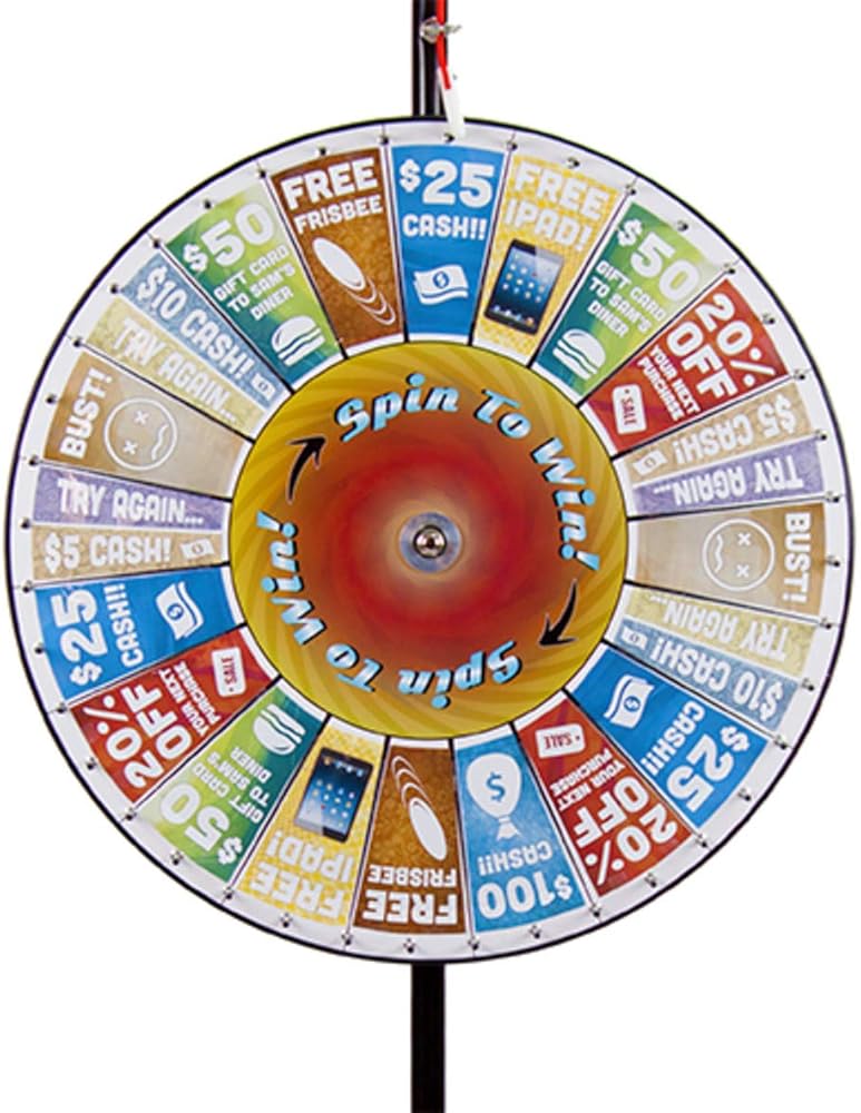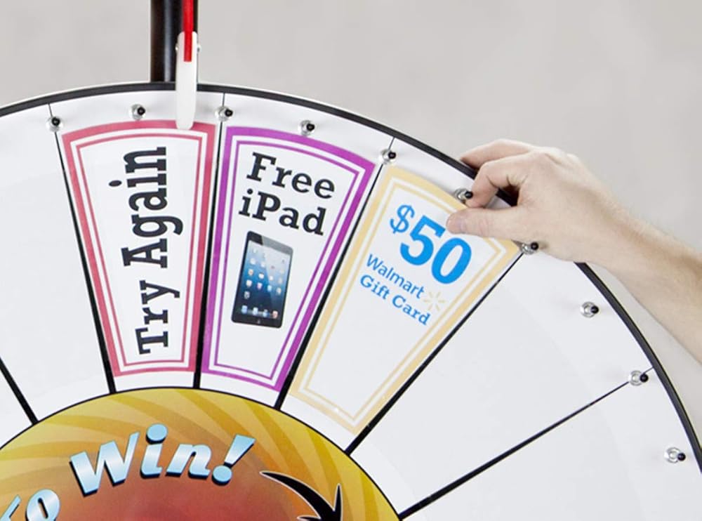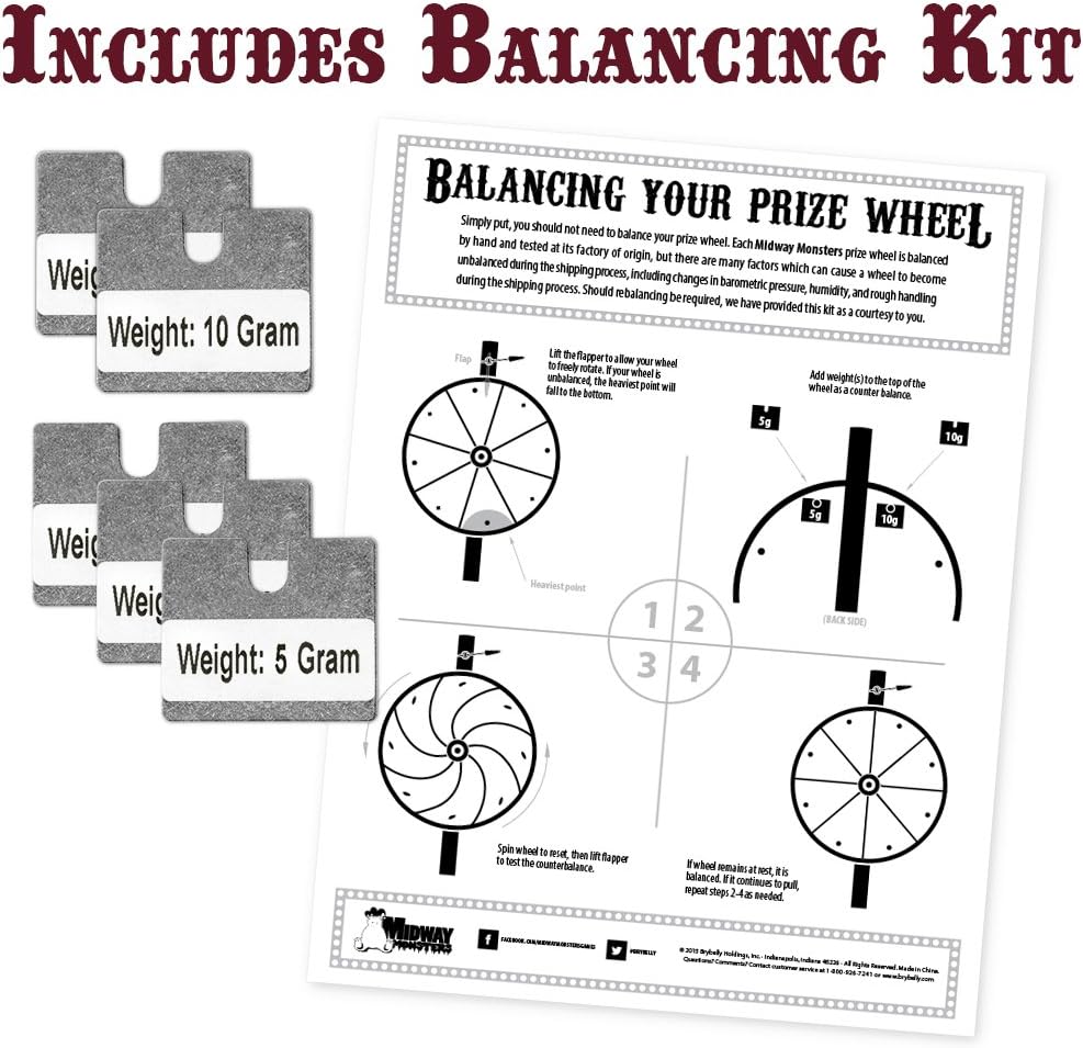 What's the best way to draw a crowd at a trade show, supercharge a fundraiser, or spice up an annual meeting? Giveaways and swag, risk and reward, flashy, eye-catching colors, and most of all—size! Our 36" Prize Wheel with customizable prize pockets is the biggest wheel we offer, and it shows. Mount the wheel on our 66" extension pole and get seen. Our prize wheels are made from the highest quality, cabinet-grade MDF wood. Each wheel is hand balanced to ensure a random spin, and the wheel spins on maintenance-free, aircraft-quality bearings. The wheel is ringed by durable black edge molding and heavy-duty 1/4" pins with plastic end caps. Inserts are securely held in place by lock nuts, and a professional red urethane clapper with a white Delran tip clicks away with every spin before making its choice. Each wheel has a 36" diameter and comes with a powder-coated, black metal base and steel extension pole. The base height is 17.5", but when the pole is fully extended it stands at an impressive 66" tall. Brilliant white laminate covers the front surface of each wheel, which is broken out into twenty 4.8" x 8" sections just begging to be customized. Inserts are not included, but you can download a template PDF by visiting the Midway Monsters Facebook page. You can print the PDF and decorate it by hand, or place it into any image editing program (not provided) and digitally manipulate it to your heart's content.