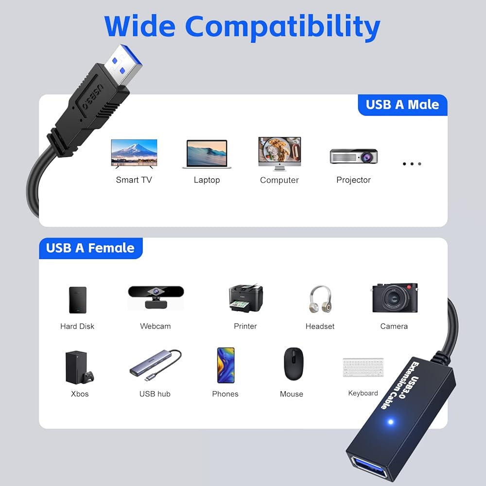 توافق عالمي: يمكنك استخدام كابل USB 3.0 لتمديد المسافة بين جهازك وجهاز الكمبيوتر الخاص بك أو منافذ الشحن، مثل الهاتف الذكي، ومحركات أقراص فلاش USB، والأقراص الصلبة، وأجهزة تحكم PS4، وقارئات البطاقات، ومحولات البلوتوث، ولوحات المفاتيح، والفئران، وكاميرات الويب، لوحة الألعاب، بلاي ستيشن، إكس بوكس، سماعة الواقع الافتراضي، المحور، الطابعة، الماسح الضوئي، الكاميرا. توفير نقل البيانات والشحن لأجهزتك بسهولة