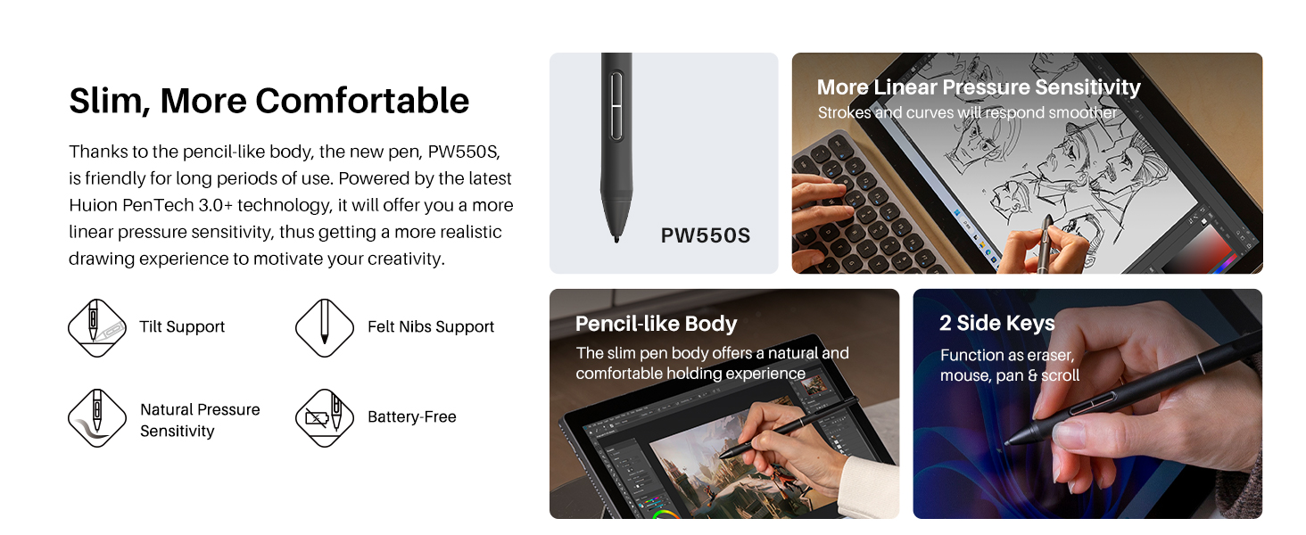 [أداء محسّن للقلم]: يتميز بجسم أنحف وأحدث إصدار من PenTech 3.0+، ويتميز قلم Slim Pen PW550S بقوة تنشيط أولية أقل وضربة قلم أكثر سلاسة بدقة فائقة، مما يوفر لك تجربة رسم أكثر طبيعية أقرب ما تكون إلى القلم القياسي قدر الإمكان.