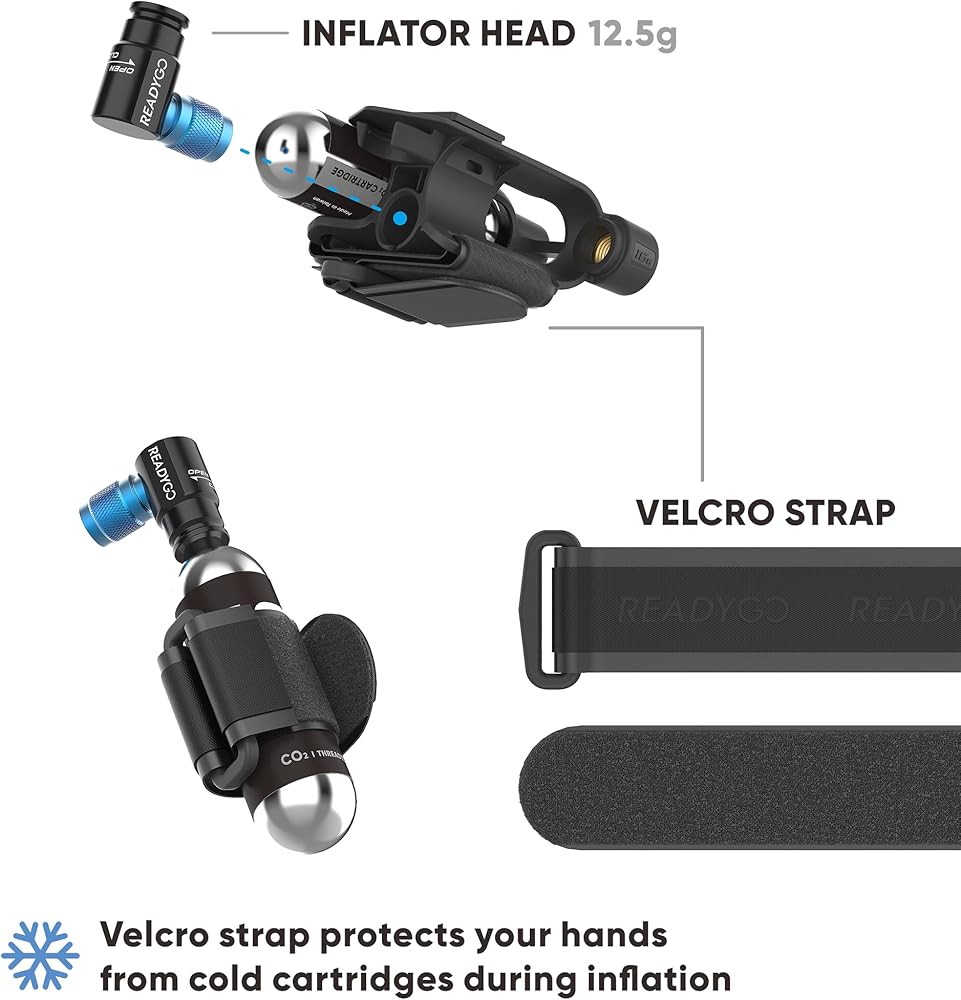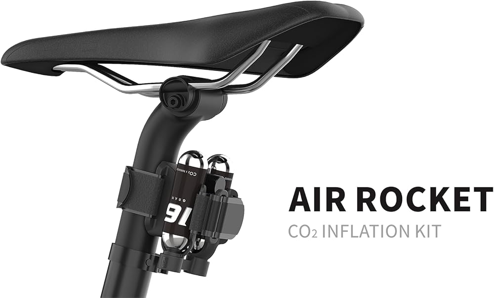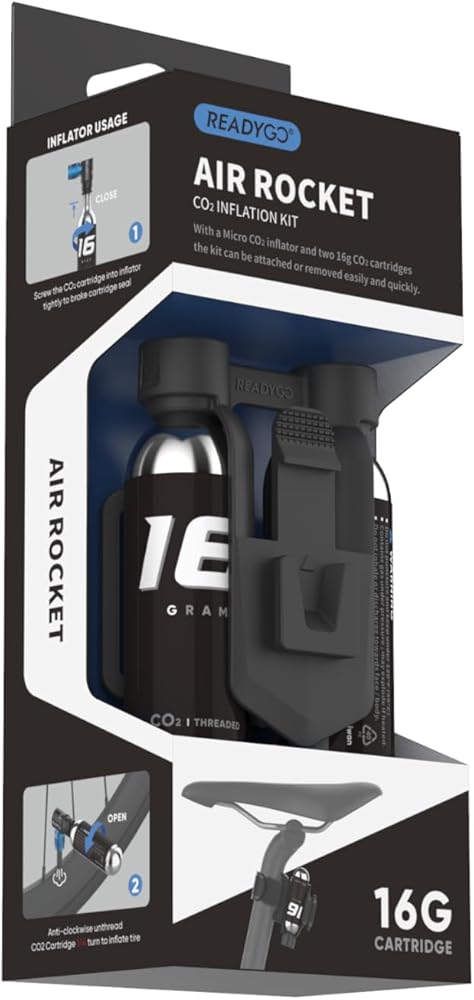 Our ultimate Bicycle CO2 inflation kit is designed to take your cycling experience to new heights. This innovative kit features an ingenious mounting bracket that securely attaches to either your bike seat post or top frame tube using the included Velcro strap, ensuring easy access whenever you need it. Plus, it seamlessly "clicks" onto the LUMIS tail light for added convenience. Included in the bike tool are the CO2 inflator valve, two 16-gram CO2 cartridges, and a custom mounting bracket. The mountain bike co2 thread into the bracket for a secure fit, while the tubeless inflator valve boasts its own custom molded engagement area, guaranteeing efficient inflation every time. With an additional Velcro strap for securing a spare tube and tire levers, this tire cartridge ensures you're always prepared for unexpected flats on your ride. Whether you're tackling rugged mountain trails or cruising through city streets, this bike tire CO2 kit is a must-have bicycle accessory for any cyclist. Don't let a flat tire derail your adventure – invest in the ReadyGO Air Rocket and ride with confidence.