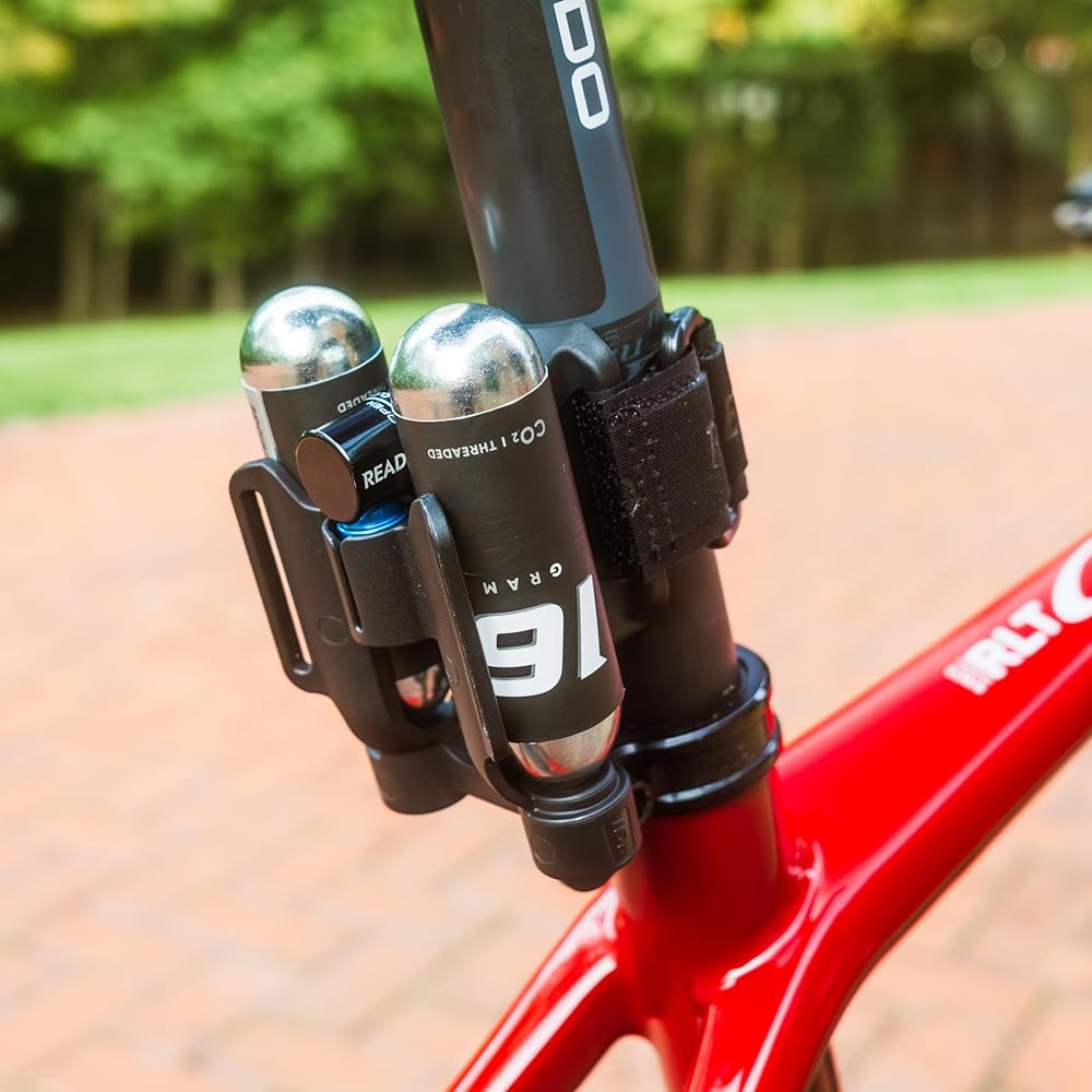 Innovative Bracket - the mounting bracket is custom-molded engineered plastic. It securely holds 2 CO2 cartridges, the included head unit, and additional tools, tubes, etc. No noisier bouncing around in a seat bag and no more losing your important tire refill tools on the pavement behind you.