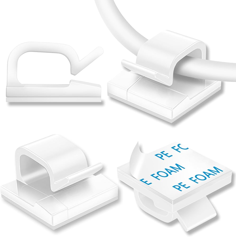 مشابك ذاتية اللصق: يمكن لمشبك حامل الكابل اللاصق مع وسادة ذاتية اللصق أن يمسك الأسطح بثبات ويمكن إزالتها بسهولة دون إتلاف سطح المكتب ودون ترك أي بقايا على الأسطح.