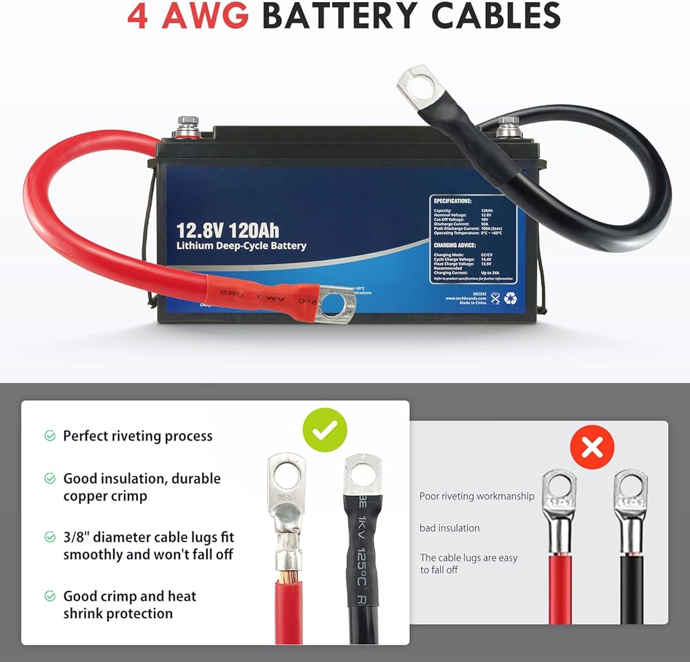 4 سلك قياس AWG: 2x طول الكابل 24 بوصة (أسود وأحمر). 4 أسلاك AWG تناسب مسامير مقاس 3/8 بوصة، سلك نحاسي رقم SAE رقم 4. موثوق به من قبل المحترفين والمتحمسين في كل مكان.