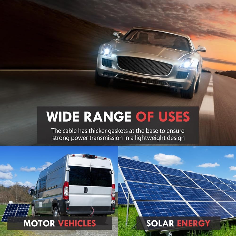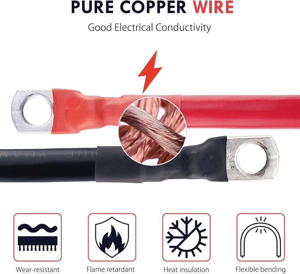 المواد: كابل بطارية 4 AWG مقاوم للهب لدرجات الحرارة العالية/سلك مطاط السيليكون المقاوم لدرجات الحرارة المنخفضة يحافظ على مرونة فائقة، الطبقة العازلة سميكة ورقيقة بشكل موحد ويمكن ثنيها حسب الرغبة وليس من السهل كسرها.
