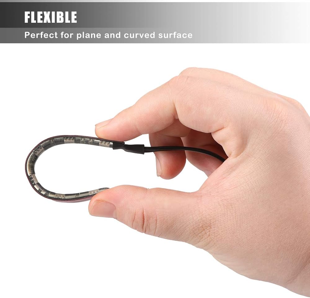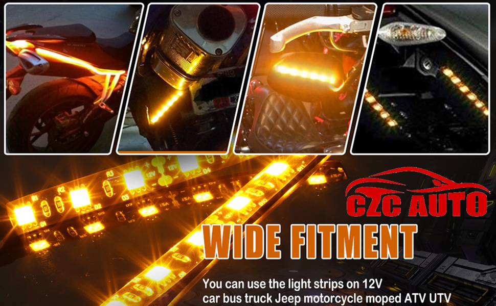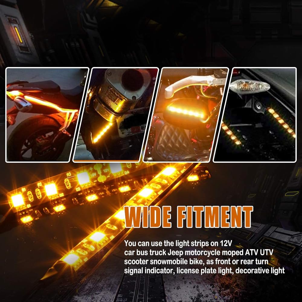 استخدام واسع: شريط إضاءة كهرماني مرن مقاوم للماء يبلغ طوله 4 بوصات، ويمكن أن يعمل كمؤشر إشارة الانعطاف الأمامي أو الخلفي، أو ضوء لوحة الترخيص، أو ضوء تزييني لسيارة جيب والدراجات النارية والدراجات البخارية ATV UTV والدراجة الثلجية. أو في أي مكان تعتقد أنه يمكن استخدامه فيه.