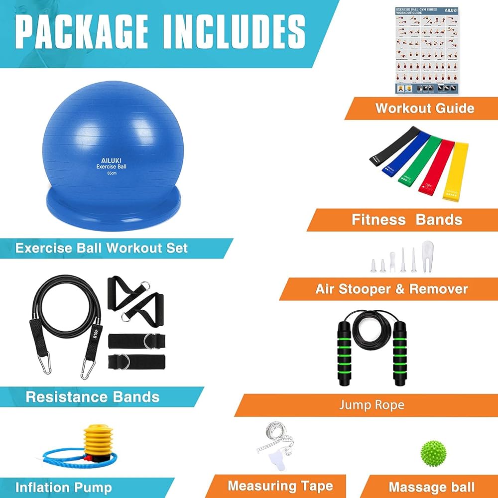 الحزمة والخدمة: مجموعة الصالة الرياضية المنزلية لدينا تأتي مع 1 * كرة تمرين 65 سم، 1 * قاعدة ثبات قابلة للإزالة، 1 * مضخة قدم نفخ أسرع، 5 * أربطة مقاومة للياقة البدنية، 1 * دليل التمرين، 1 * حبل القفز، 1 * جهاز قياس نوع الكرة ، 6 × سدادة ومزيل للهواء، 1 × كرة رسالة. بالإضافة إلى ذلك، نقدم استرداد الأموال لمدة 90 يومًا.