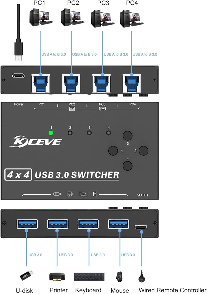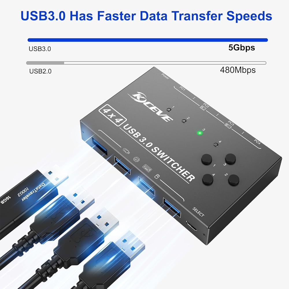 USB 3.0 Switch Selector 4 أجهزة كمبيوتر مشاركة 4 منافذ USB 3.0، مفتاح 3.0 لمفتاح لوحة المفاتيح والماوس، محول USB متوافق مع Mac/Windows/Linux، جهاز تحكم سلكي و4 كابل USB 3.0 متضمن