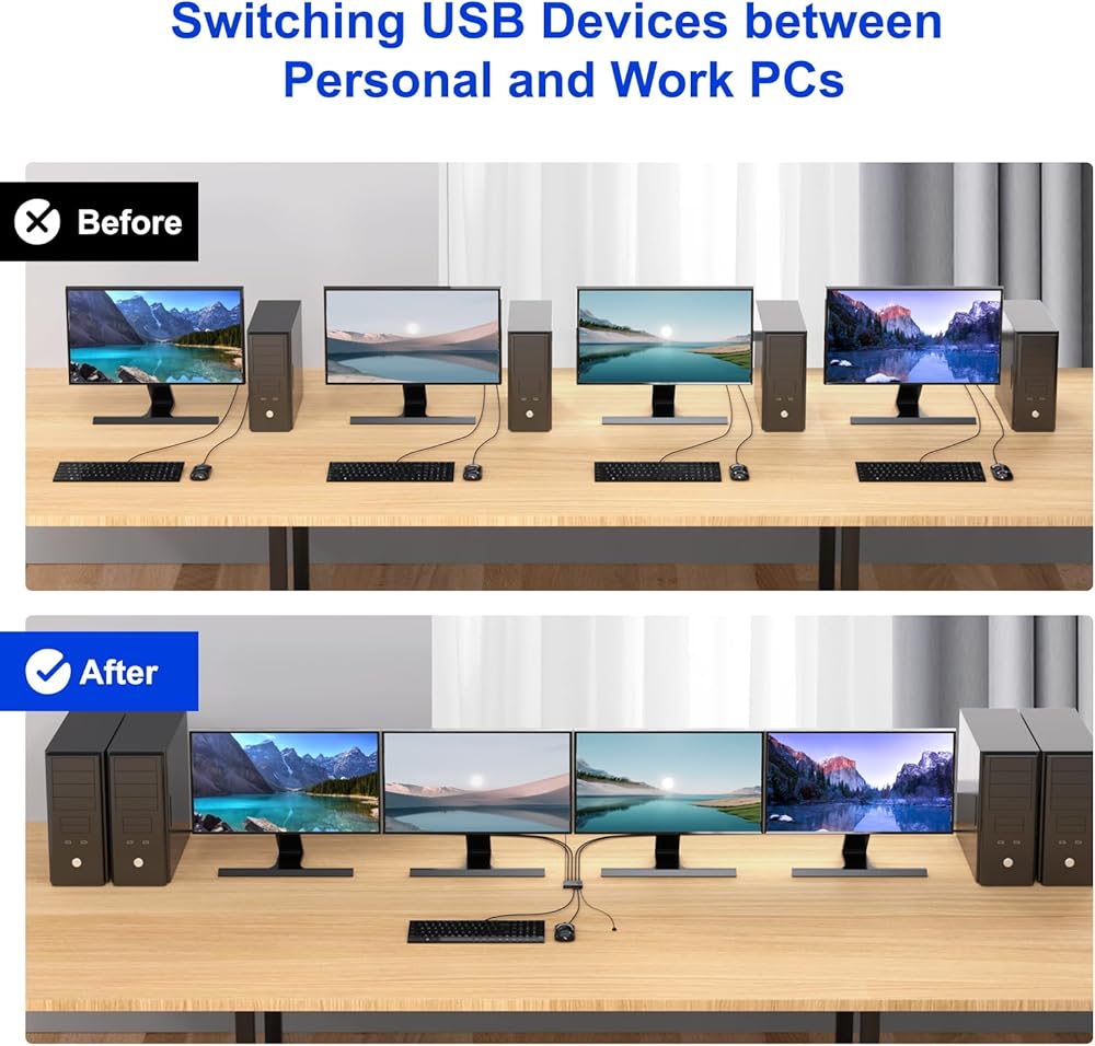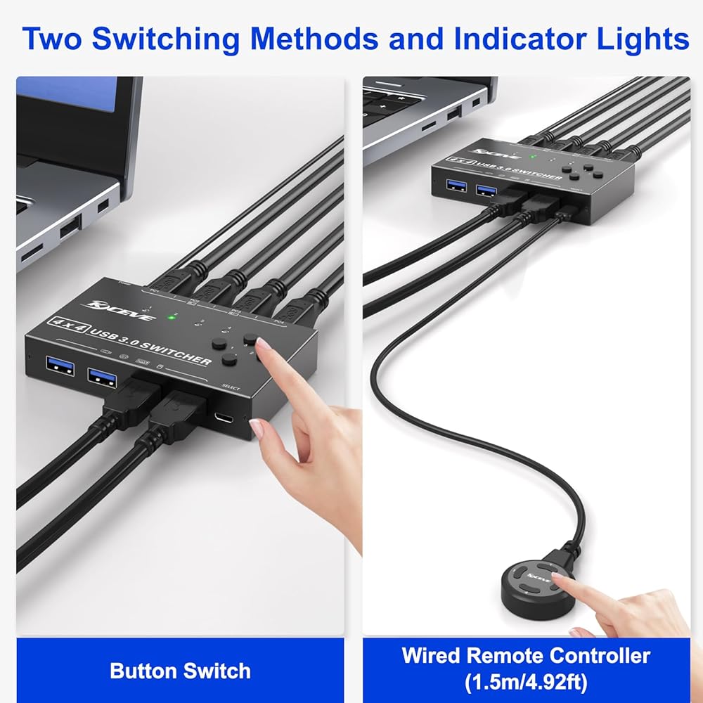 【تبديل الأزرار والتبديل السلكي عن بعد 】مع زر تبديل USB والتبديل السلكي عن بعد وتصميم مؤشر LED، يمكنك تبديل أجهزة USB المتعددة بحرية بين 4 أجهزة كمبيوتر بنقرة واحدة أو جهاز تحكم سلكي ومعرفة حالة العمل بوضوح. جهاز التحكم عن بعد السلكي المتضمن ( 1.5 م/4.92 قدم) يتيح لك أن تقول وداعًا للكابلات الفوضوية الموجودة على مكتبك.