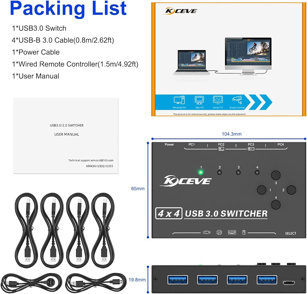 【محول USB 3.0 4 في 4 مخرج 】 يدعم محول USB 4 في 4 مخرج 4 أجهزة كمبيوتر تشترك في 4 أجهزة USB مثل لوحة المفاتيح والماوس وقرص U والطابعة والماسح الضوئي وما إلى ذلك. إنه مناسب لك للتبديل بحرية بين كمبيوتر العمل والكمبيوتر الشخصي .