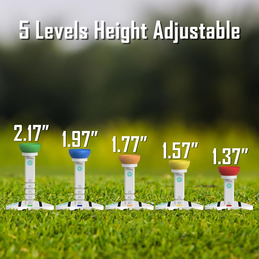 تيشيرتات الجولف ذات الارتفاع القابل للتعديل: توفر تيشيرتات الجولف المبتكرة لدينا 5 مستويات ارتفاع يمكنك ضبطها: 1.37 بوصة، 1.57 بوصة، 1.77 بوصة، 1.97 بوصة، 2.17 بوصة. قم بتغيير الارتفاع عن طريق إدخال القرص المثلث في فتحة تي شيرت الجولف، ثم قم بتدويرها بمقدار 90 درجة، ولن تحتاج إلى إحضار قمصان جولف أخرى معك.
