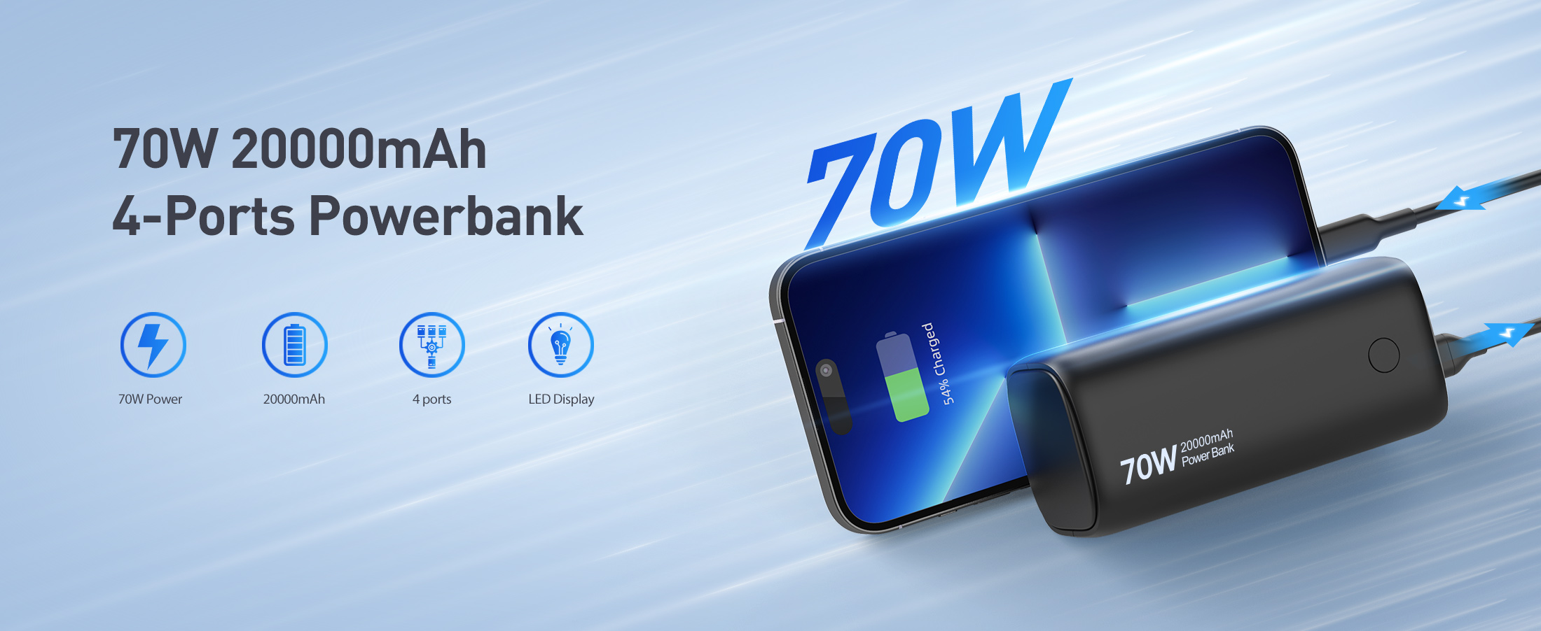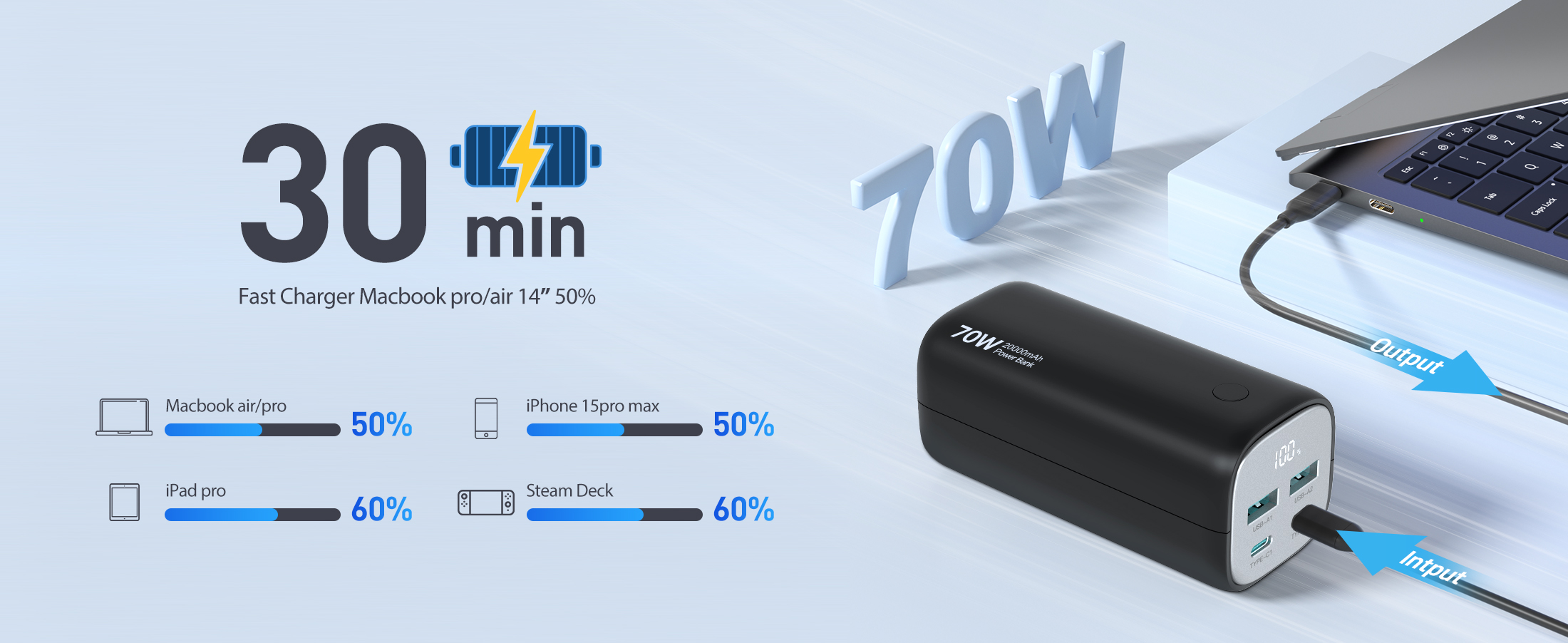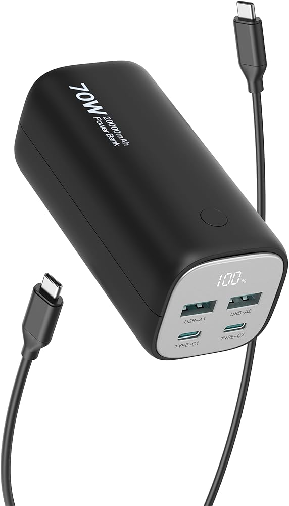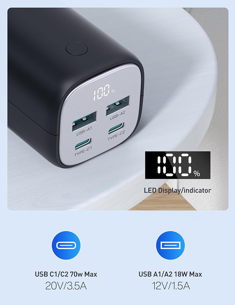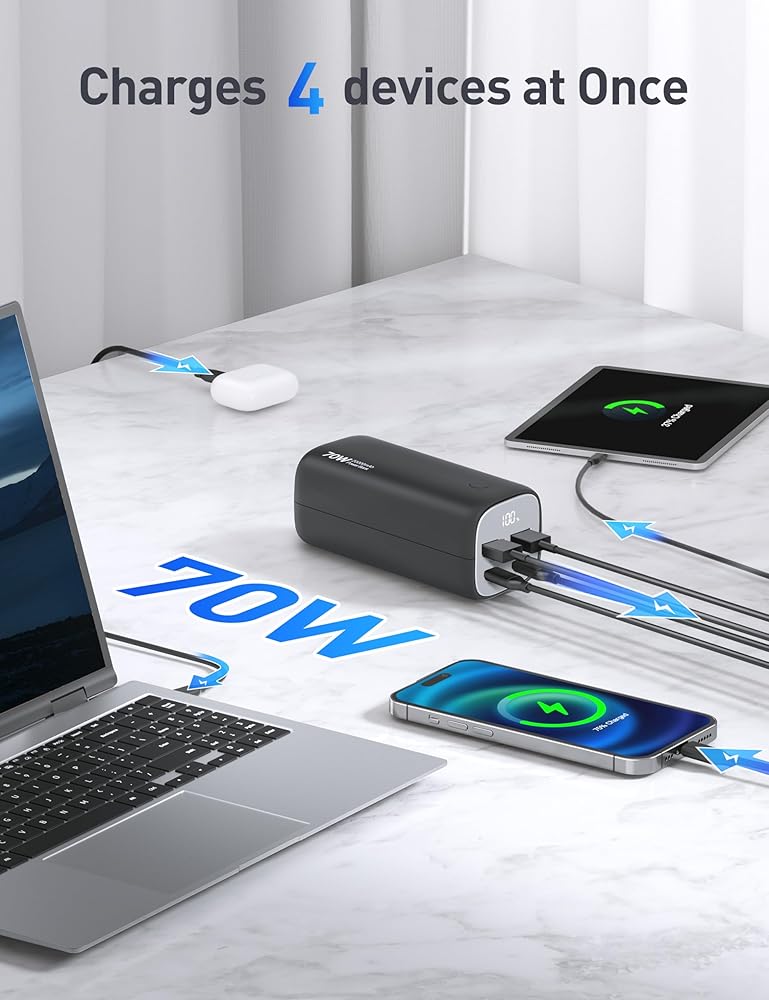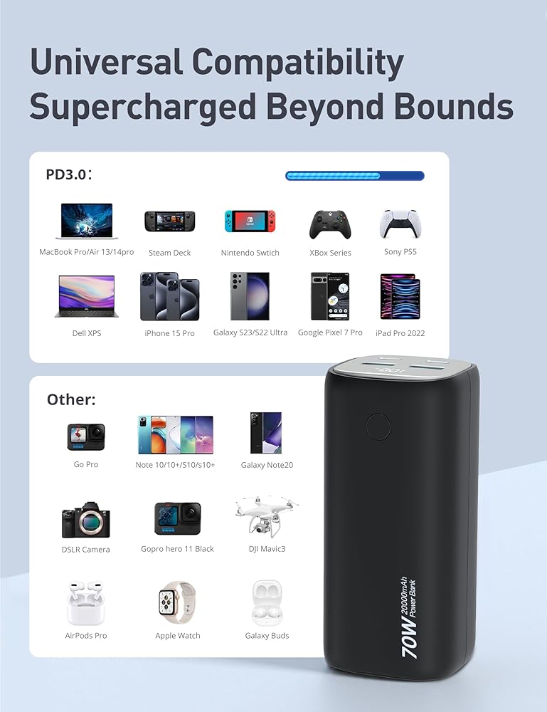 【توافق عالمي】 - بنك الطاقة هذا بقدرة 70 وات مع PD 3.0 وQC 3.0 متوافق على نطاق واسع مع أجهزة الكمبيوتر المحمولة والهواتف الذكية والأجهزة اللوحية والساعات الذكية والمزيد. يعمل بشكل جيد مع أجهزة MacBook وDell XPS وiPad وiPhone15 pro وGalaxy S23 وSteam Deck وNintendo Switch وGoPro وApple Watch والمزيد.