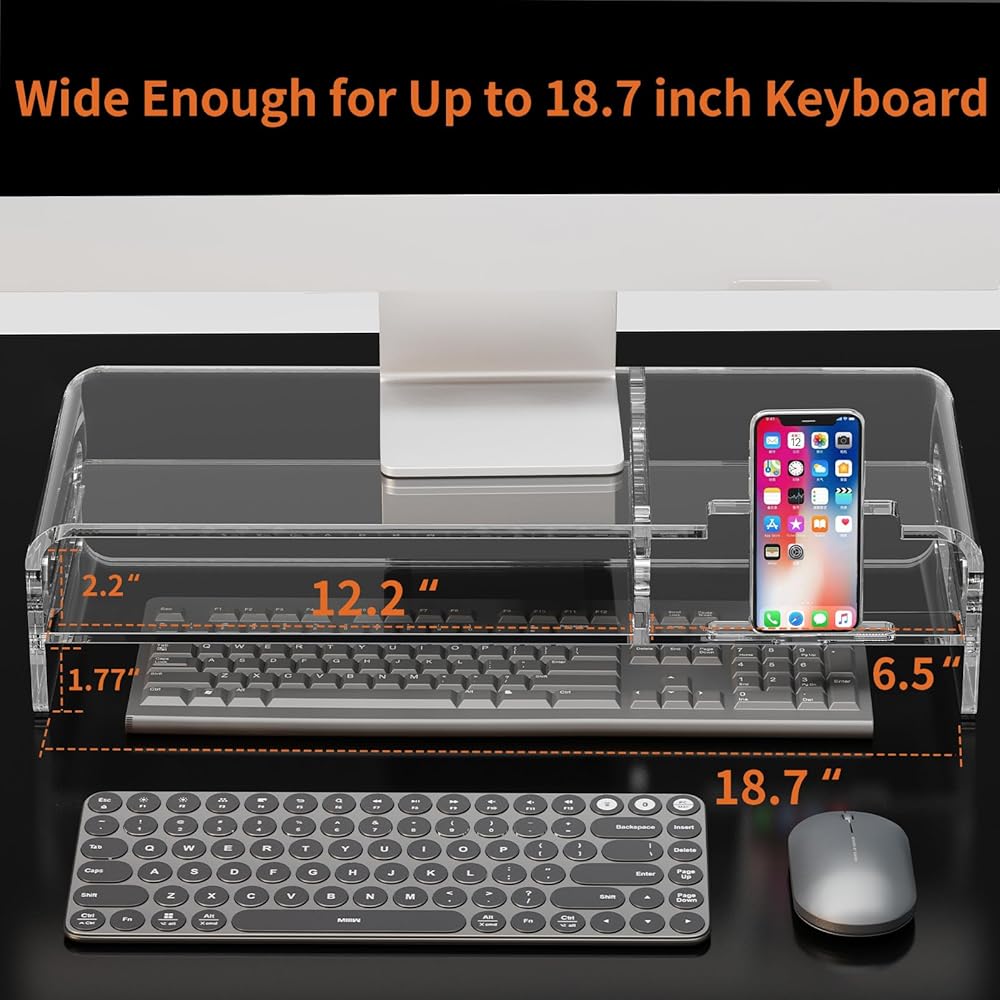 أنشئ مساحة للوحة المفاتيح الخاصة بك: يحتوي حامل الشاشة الأكريليك الكبير هذا مع الرف على مساحة إضافية بالأسفل لاستيعاب لوحة مفاتيح مقاس 18.7 بوصة. بالإضافة إلى ذلك، يمكنك وضع اللوازم المكتبية مثل الكتب والمذكرات والدفاتر وسماعات الرأس والورق والدباسات أسفل حامل الكمبيوتر المحمول الأكريليك.