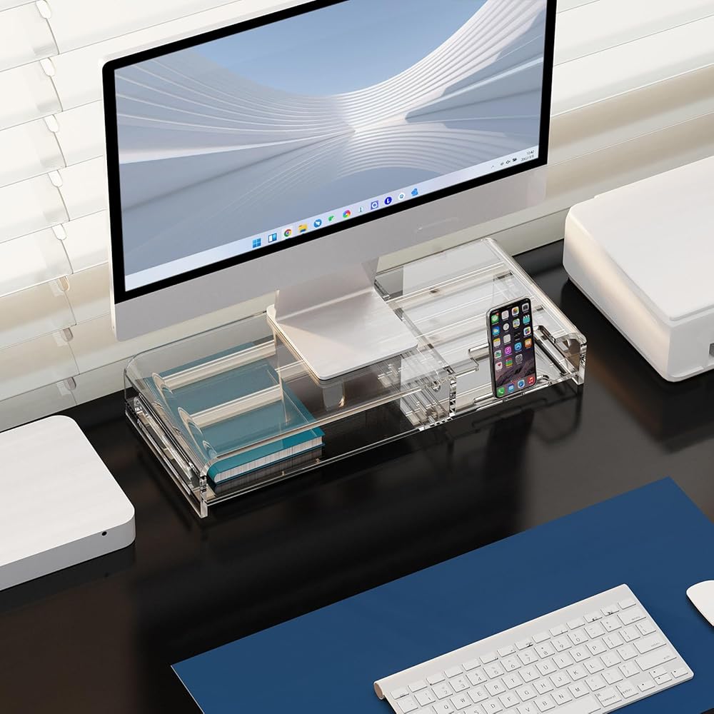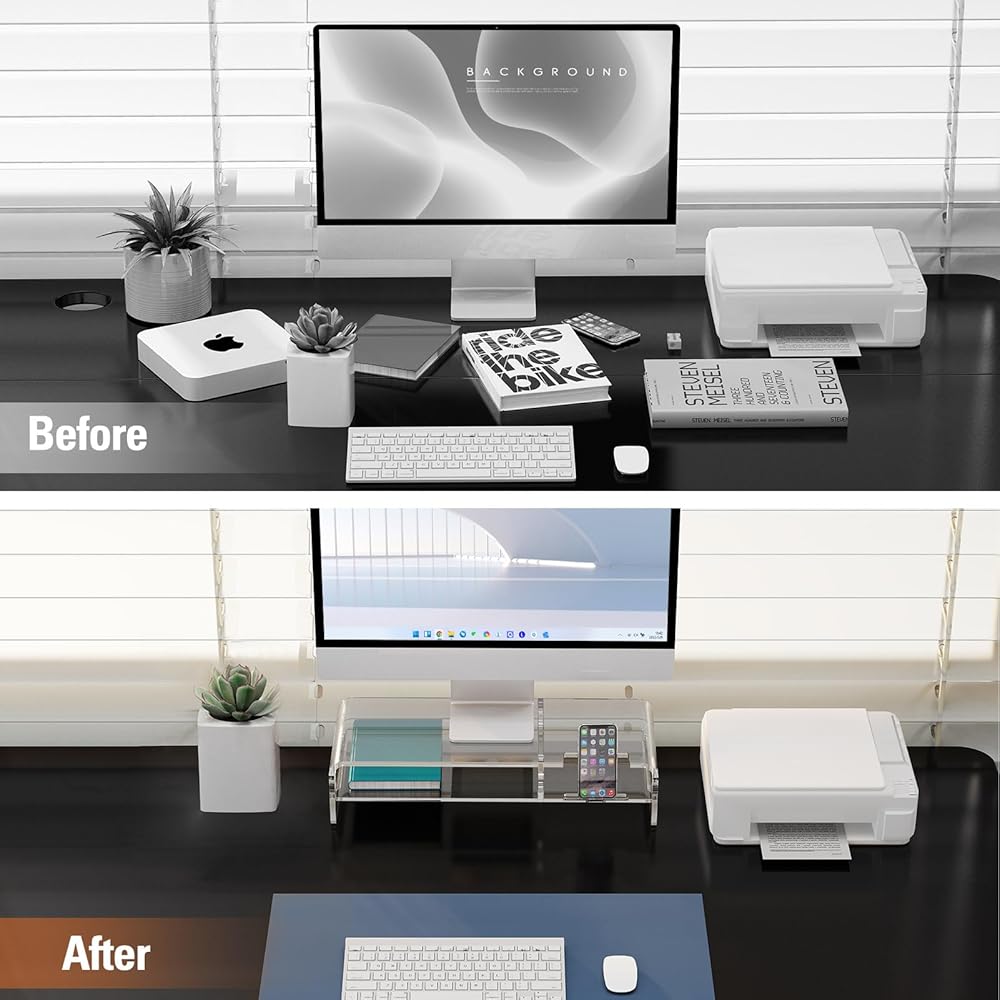 متعدد الاستخدامات: يحتوي جهاز رفع الشاشة الشفاف ذو الطبقتين بسمك 0.32 على منصة مقاس 20 × 8 بوصة تناسب معظم الأجهزة مثل شاشات الكمبيوتر الشخصي وأجهزة الكمبيوتر المحمولة والهواتف المحمولة والمزيد. بفضل المادة الشفافة، يمكنك بسهولة رؤية ملحقات مكتبك أسفل حامل الشاشة الشفاف