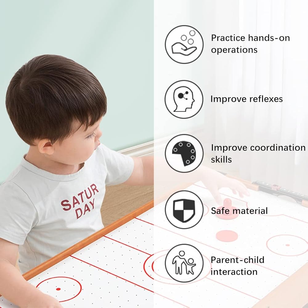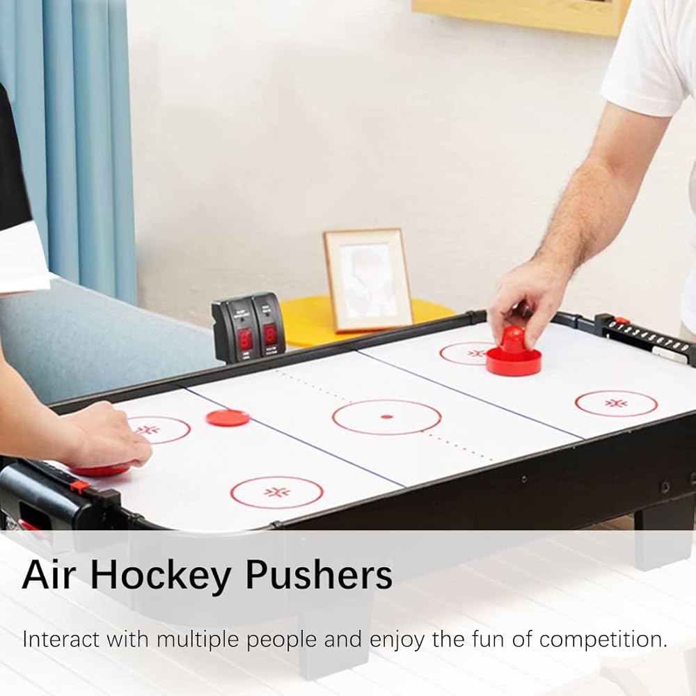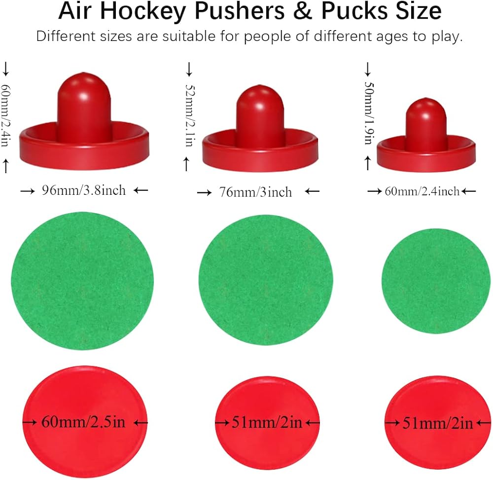 【حجم معدات الهوكي الهوائي】3 أحجام لتناسب الأيدي ذات الأحجام المختلفة لإتقانها، يمكنك الاستمتاع بإثارة المنافسة بشكل أكبر. كبير: دافع 96 مم + كرة 64 مم، ارتفاع 60 مم؛ متوسط: دافع 76 مم + كرة 51 مم، ارتفاع 52 مم؛ صغير: دافع 60 مم + كرة 51 مم، ارتفاع 50 مم.