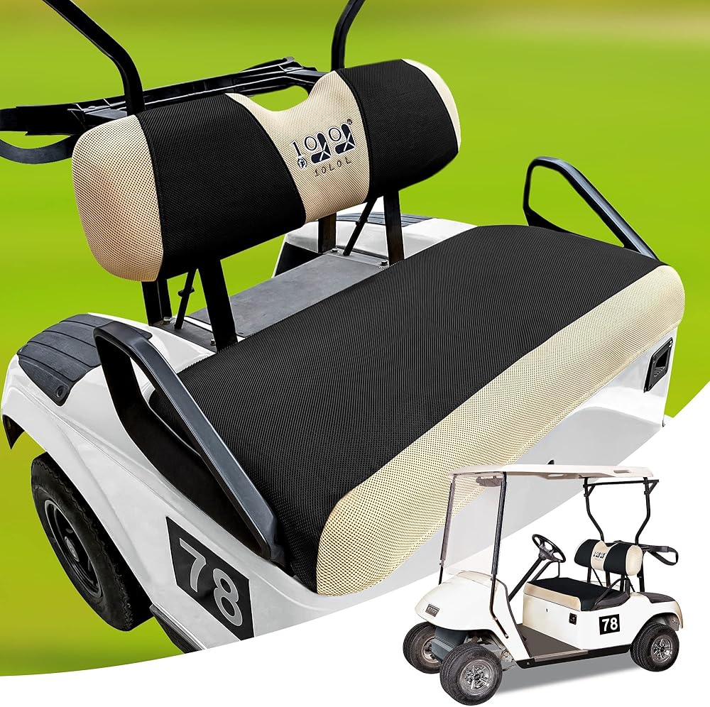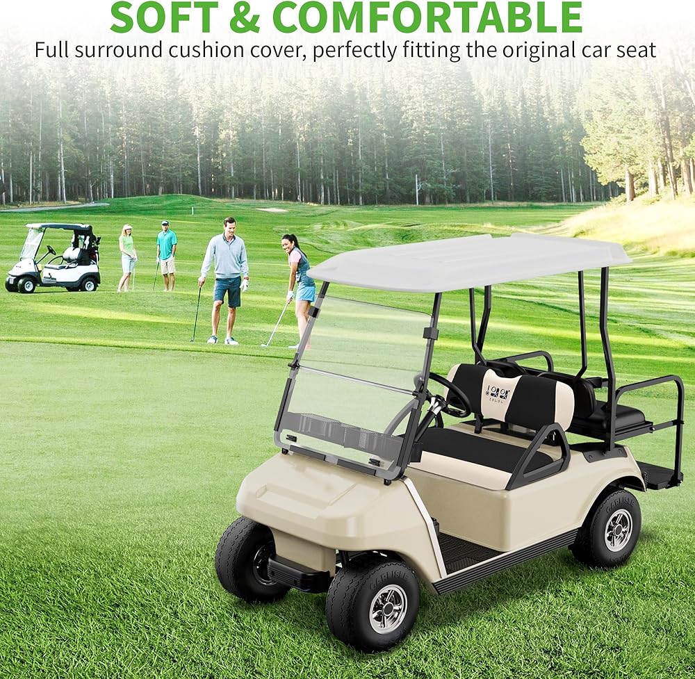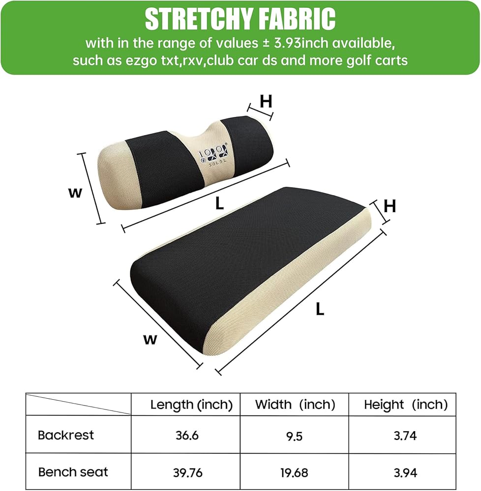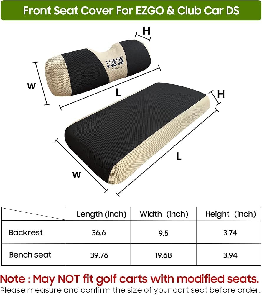 يناسب المركبات: الحجم العالمي مناسب لمعظم عربات الجولف القياسية EZGO TXT RXV & Club Car DS. إذا تم زيادة سمك مقعدك وتوسيعه وترقيته، فيرجى قياس حجم مقعد عربة التسوق الخاصة بك لضمان ملاءمة الأغطية.