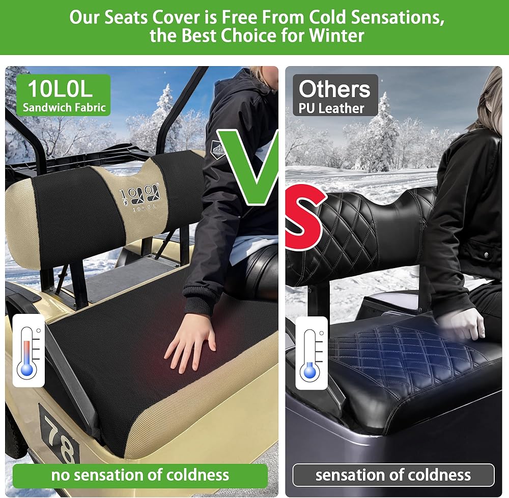 تصميم أنيق: تتميز مجموعة أغطية المقاعد الكاملة 10L0L بتصميم أنيق بلونين، وتصميم رشيق، مما يجعل من السهل إضافة لمسة من الألوان إلى عربة الجولف الخاصة بك وجعلها تبدو فاخرة. ويمكن لتصميم حافة التغليف الكاملة أن يحمي مقعدك بشكل أفضل.