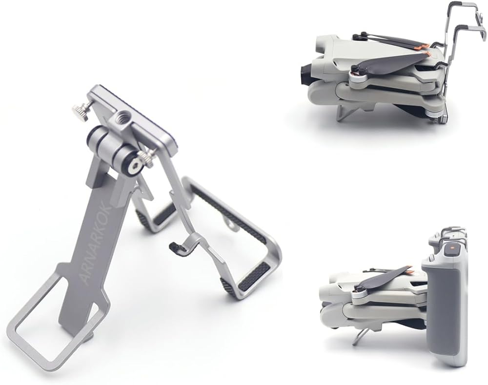 Arnarkok metal stand for dji mini pro 3, onto the remote control through the positioning screw hole, and then fix the mini 3 Pro onto this bracket, bind the remote control and mini 3 Pro together for a beautiful and neat storage effect!