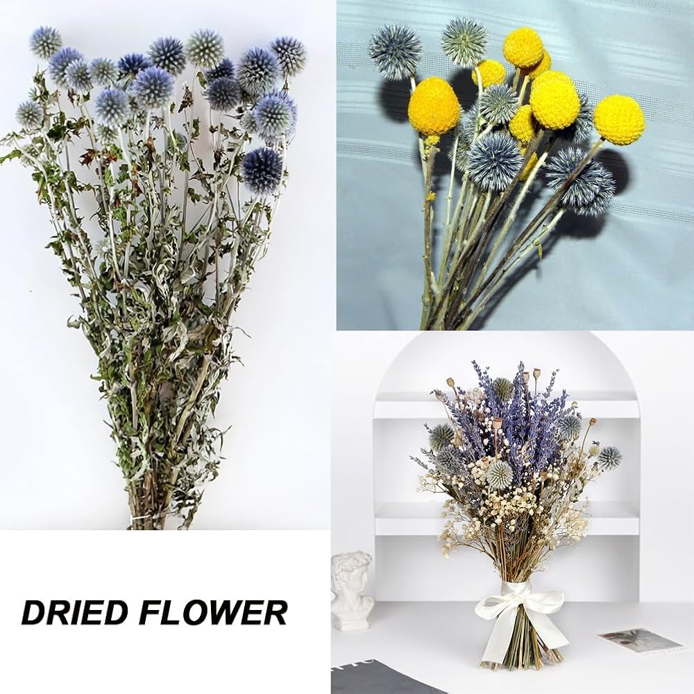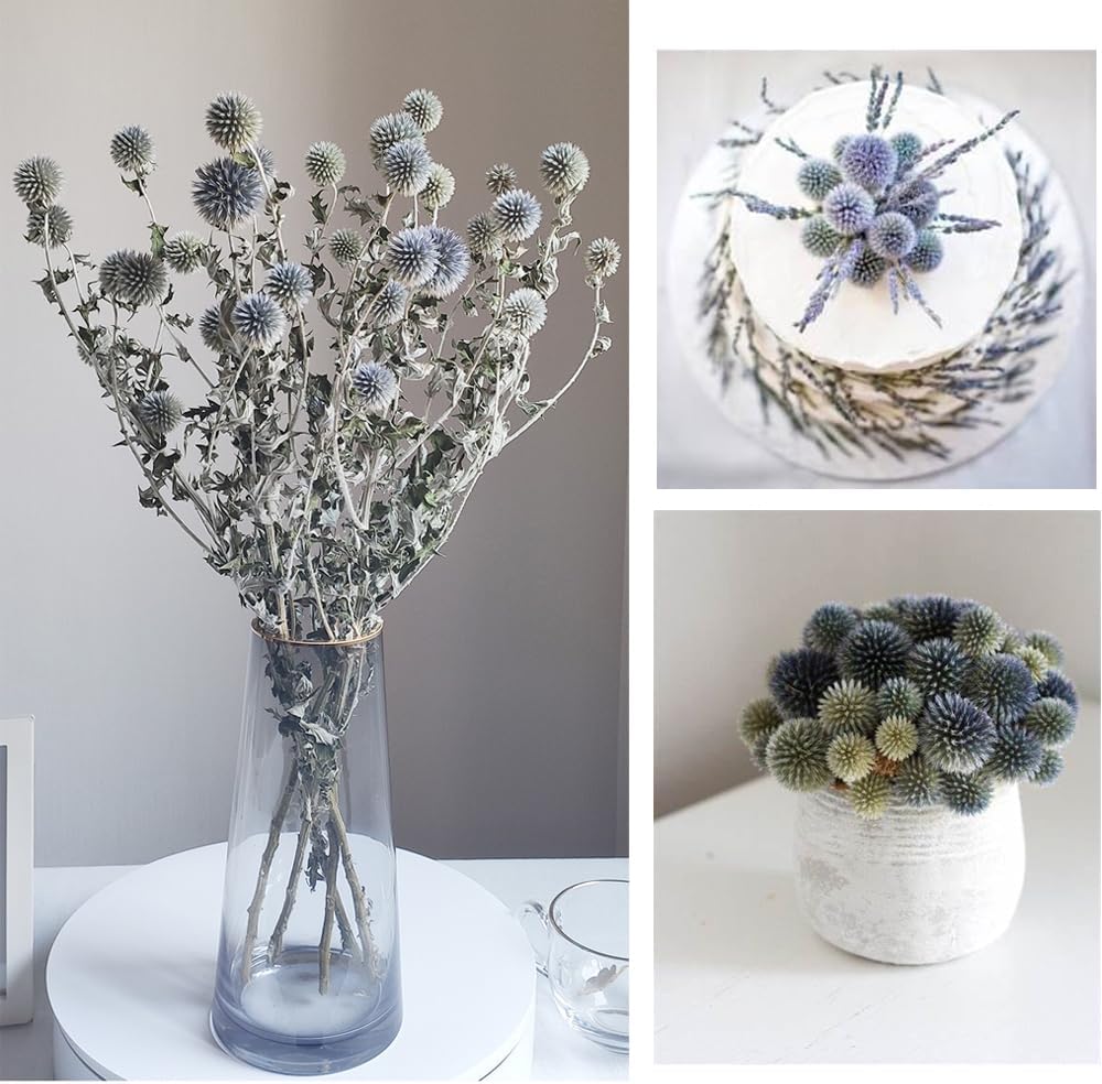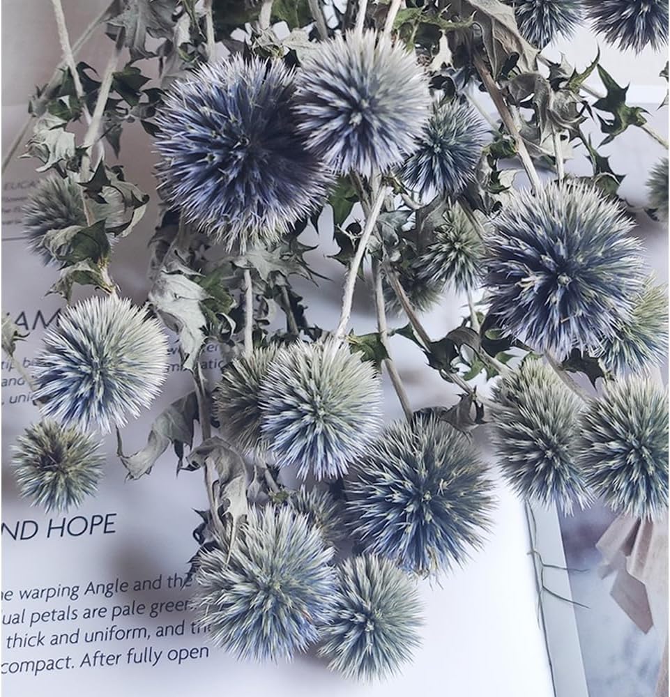 الحجم: يبلغ طول حزم الزهور المجففة حوالي 16 بوصة، بإجمالي 18-22 كرة زرقاء لكل باقة.
