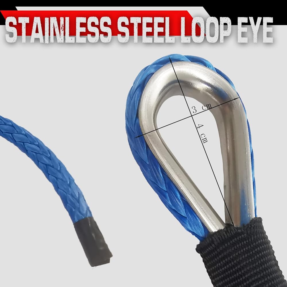 【PROTECTION DESIGN】:one end of the synthetic winch rope with 35mm x 20mm stainless steel eye-thimble and The 1m black protective sleeve has remarkable effect in preventing wear, sun protection, overheating and corrosion, greatly extending the service life of the synthetic rope.