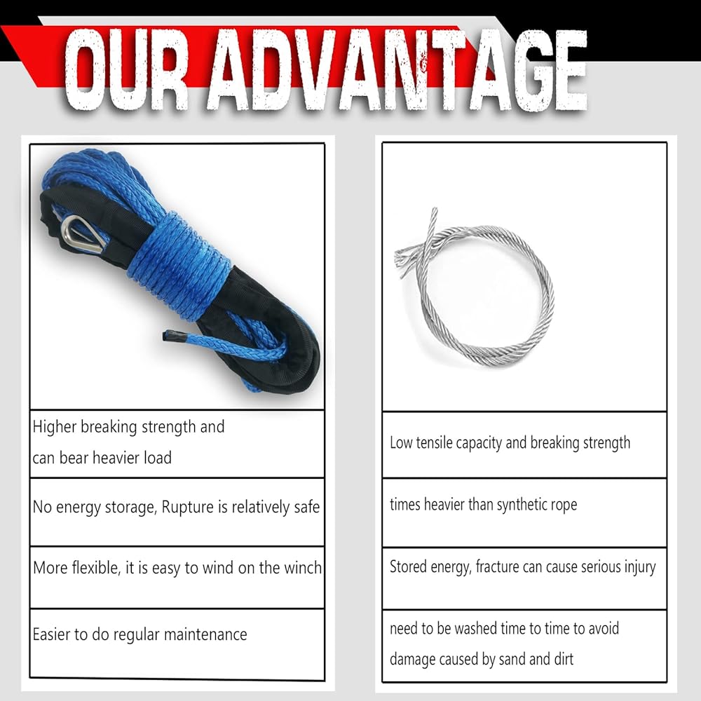 【EFFICIENT USE AND EASY CLEANING】: This synthetic winch rope will not kink like steel wire rope. There is no rust and wire fragments. It can be easily cleaned with mild soap and water.