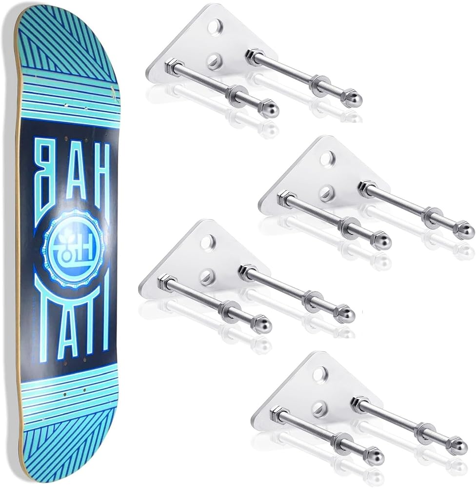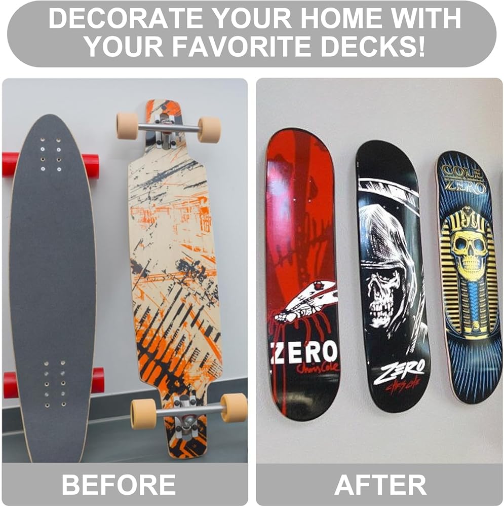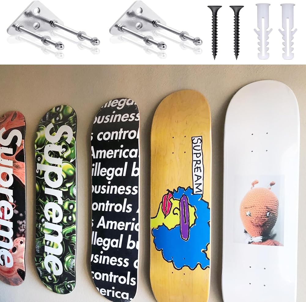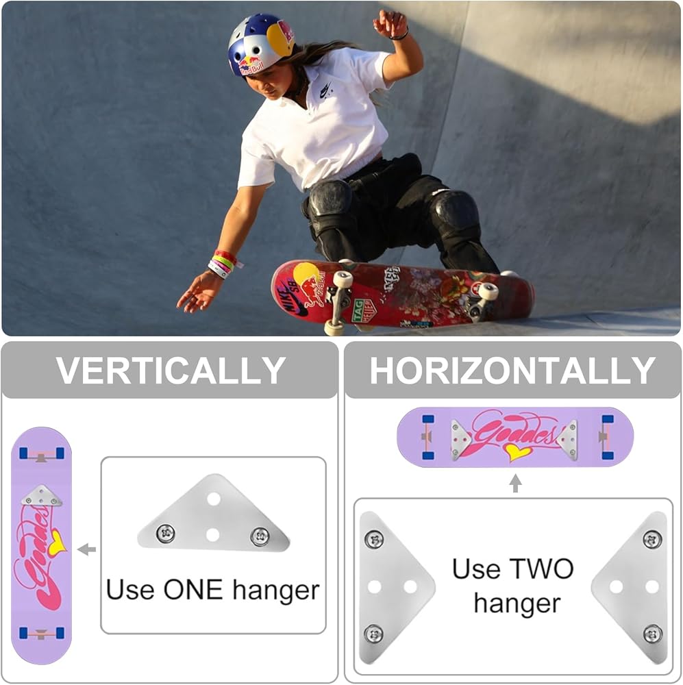 • شاشة تخزين لوح التزلج: حامل حائط لوح التزلج للعرض. حجم المسمار يناسب معظم ألواح التزلج والسطح العلوي والألواح الطويلة. مجموعة التثبيت على الحائط على لوح التزلج تحتوي على شماعات. يمكنك استخدام علاقة واحدة لتعليق اللوحة عموديًا أو استخدام علاقتين لتعليق اللوحة أفقيًا.