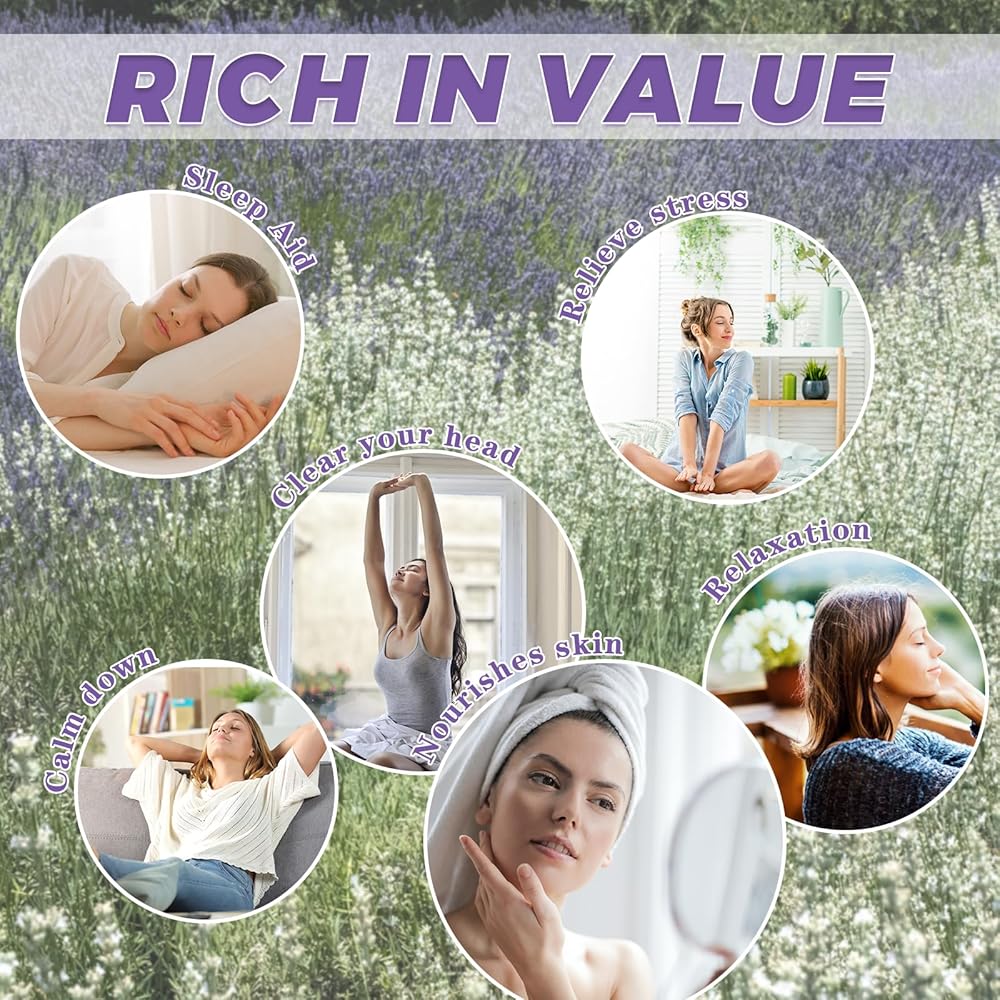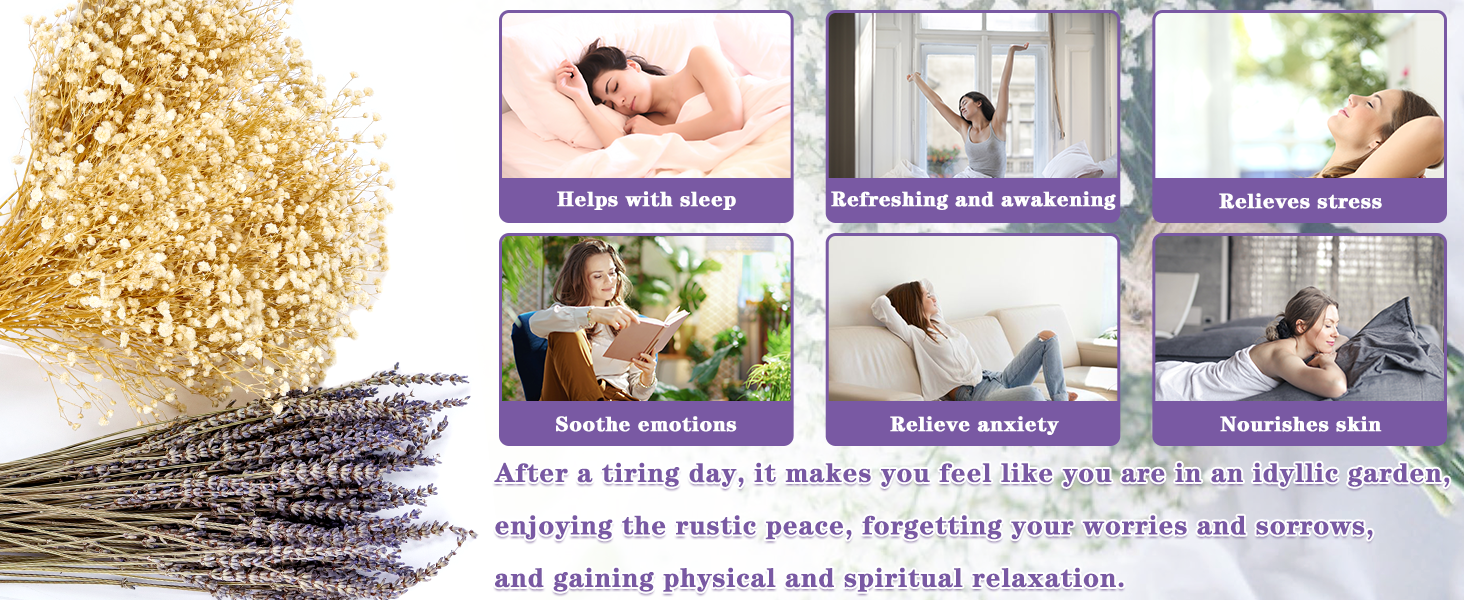 𝑹𝑰𝑪𝑯 𝑽𝑨𝑳𝑼𝑬 -- اللافندر له تأثير جيد مهدئ ومهدئ وتخفيف التوتر. كما أنه مفيد جدًا للأشخاص الذين يعانون من صعوبة في النوم. كما أنه مناسب جدًا لليوجا والتأمل. وبعد يوم متعب، شم رائحة زهور اللافندر. وحزم التنفس من Gypsophila Baby تجعلك تشعر وكأنك في الريف وتستمتع بالهدوء الريفي.