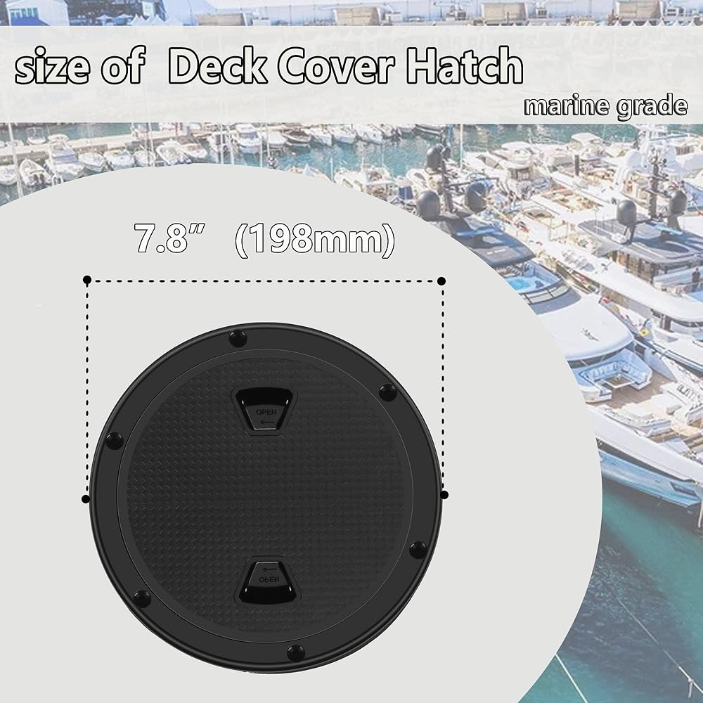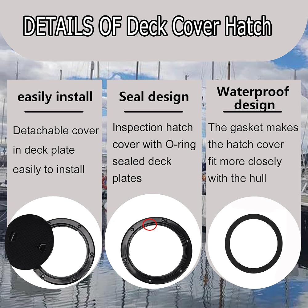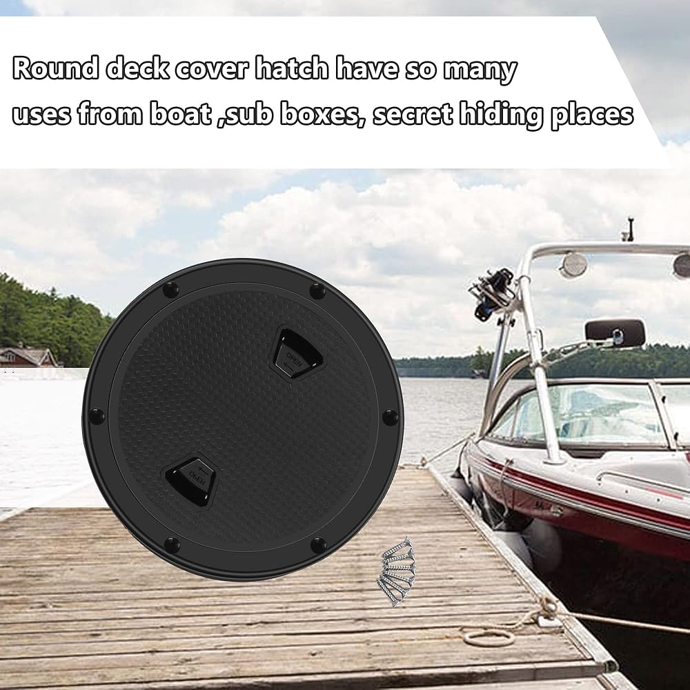 Inspection hatch cover with O-ring sealed deck plates are ideal for interior and exterior applications.Deck plates has eparate cover plate and chassis.It is can be used for internal and external applications.IDesigned with a non-skid surface allowing horizontal as well as vertical mounting. round deck cover hatch have so many uses from boat ,sub boxes, secret hiding places and used for portable AC unit in cargo trailer RV conversion. boat deck access hatch made of ABS material,Anti-aging, Anti-ultraviolet, reinforced design with a non-slip surface,Separate cover plate and chassis, Inspection hatch covercan install this on the rear well area of kayak to access anything that makes its way to the back and to drain any water that gets in easier.round deck cover hatch have so many uses from boat ,sub boxes, secret hiding places.