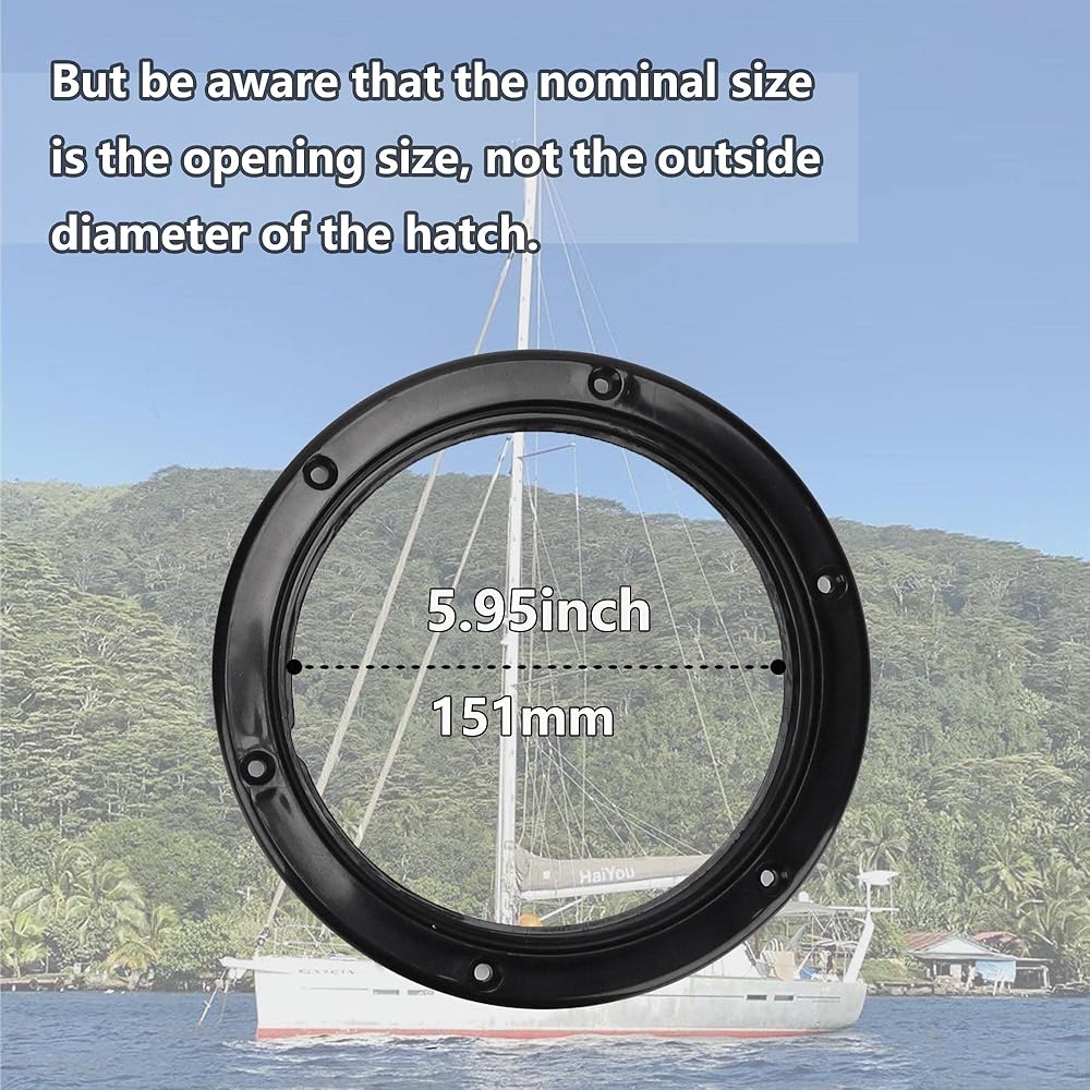 Package Includes:1 pcs deck plates for boats,1 pcs O-ring sealed ,6 pcs stainless steel screws ,But be aware that the nominal size is the opening size, not the outside diameter of the hatch.Opening Dia: 6" /151mm :External Dia: 7-4/5" (198mm) ,Cut Out Dia:6-1/3" (161mm)