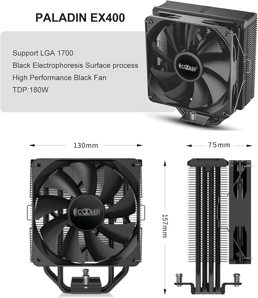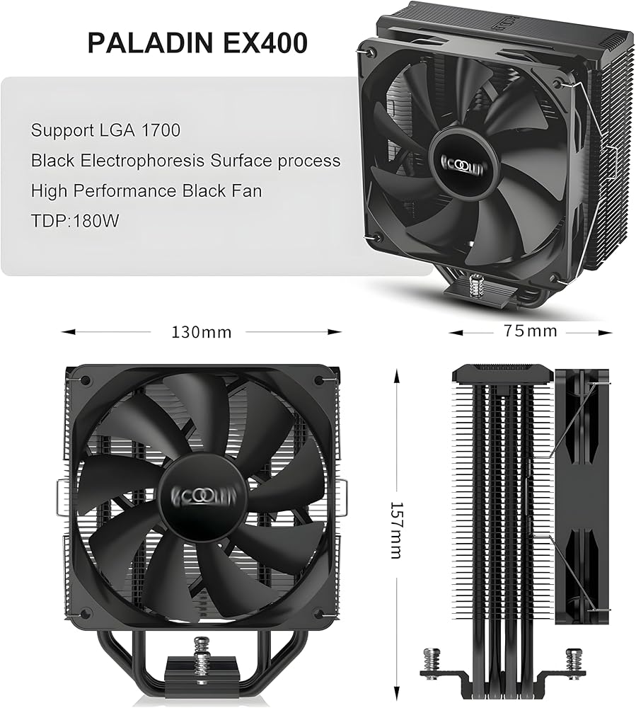 • 【مواصفات المنتج】PCCOOLER Paladin EX400؛ أبعاد مبرد وحدة المعالجة المركزية: 130 (طول) × 75 (عرض) × 157 (ارتفاع) ملم (5.12 × 2.95 × 6.1 بوصة)؛ مادة المشتت الحراري: الألومنيوم، مبرد وحدة المعالجة المركزية مجهز بمثبتات معدنية لمنصة Intel وAMD لتحقيق تركيب أفضل، تبريد البرج المزدوج أقوى (ملاحظة: يرجى التحقق من الجراب واللوحة الأم للتأكد من التوافق مع مبرد الحجم هذا.)