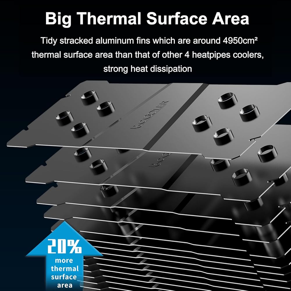 • 【مساحة سطح حرارية كبيرة】56 قطعة من زعانف الألومنيوم المكدسة والتي تبلغ حوالي 6600 سم × 6600 سم مساحة سطح حرارية أكبر من تلك الموجودة في مبردات الأنابيب الحرارية الستة الأخرى، مع مساحة أكبر لتبديد الحرارة من أجل تبديد حرارة أكثر قوة.