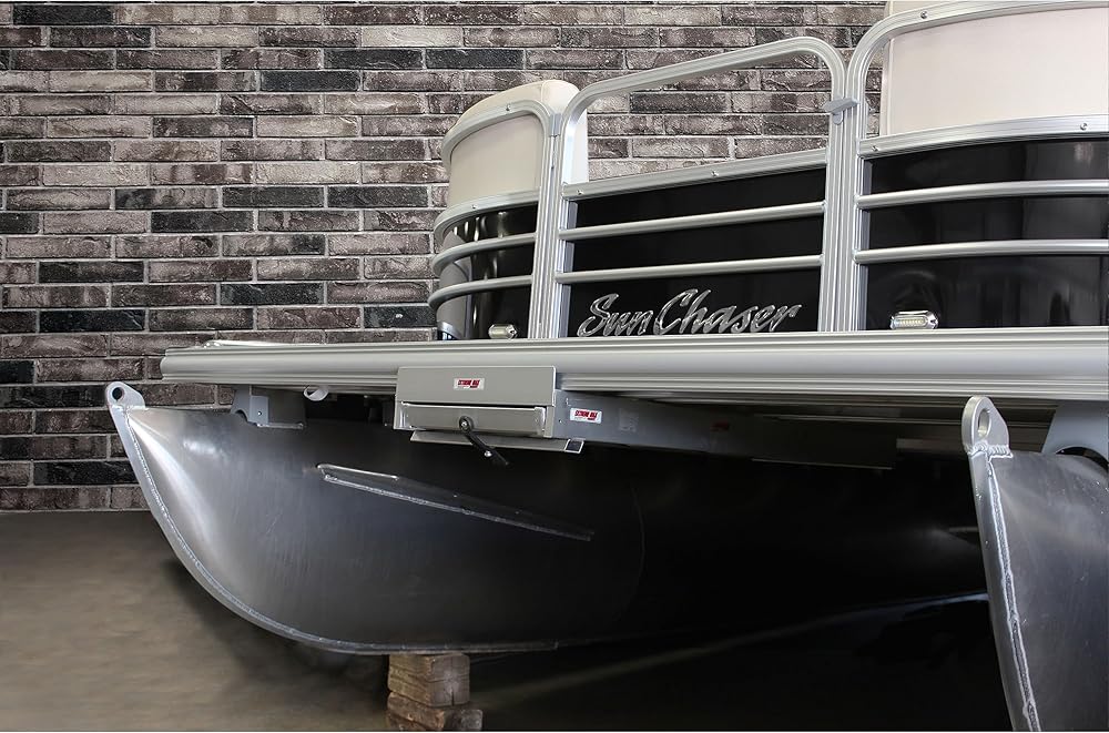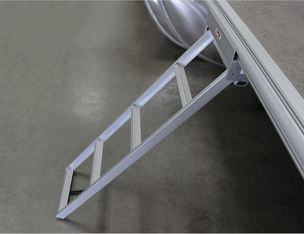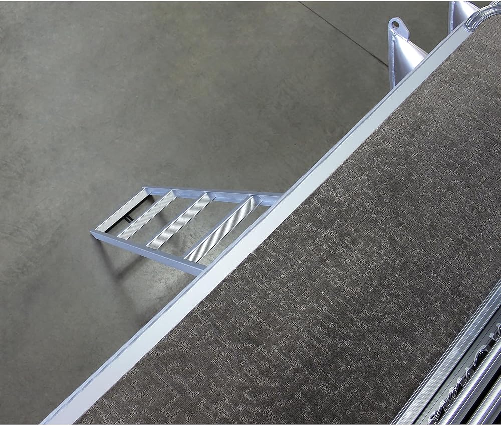 Board your pontoon easily and safely with the Extreme Max Undermount Pontoon Ladder. This welded aluminum ladder attaches to two pontoon stringers and stows under the front deck. Ladder is secured in the stowed position by a heavy-duty rubber strap. Deploy the ladder by unhooking the strap and sliding the ladder out and into the water. Wide, sturdy traction rungs make boarding comfortable for children or adults with 12" rung spacing. Boarding ladder area: 12.5" wide with 1.5" grooved rungs. Includes stainless steel mounting hardware. Note: For pontoons with underside sheeting or closed channels that do not allow access to the topside of the pontoon's stringers, additional mounting hardware will be needed and is not included. Use marine-grade stainless steel self-tapping screws to fasten your ladder in place instead of the provided mounting hardware.