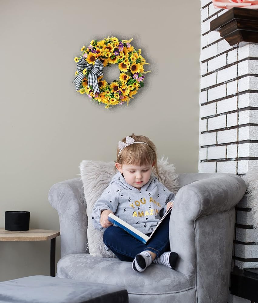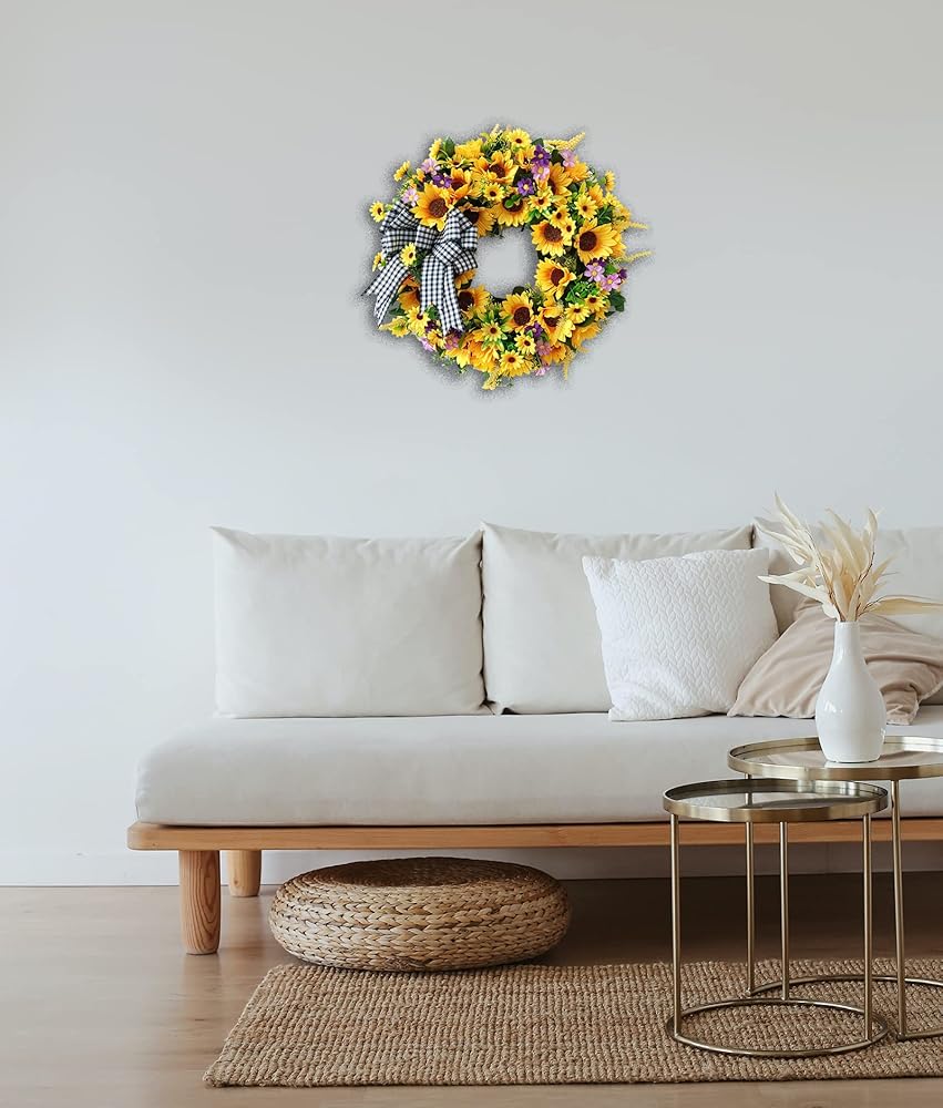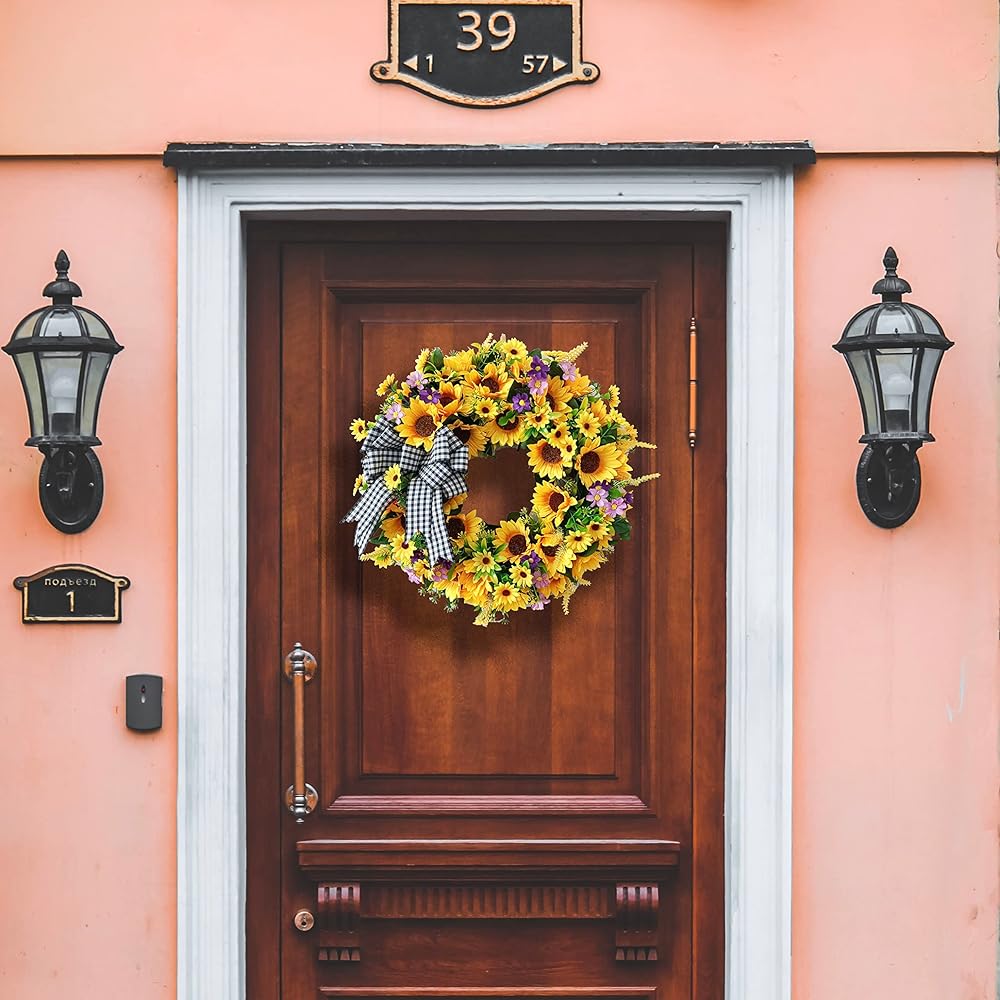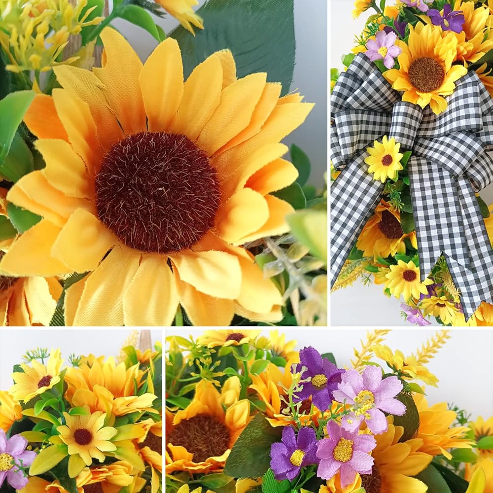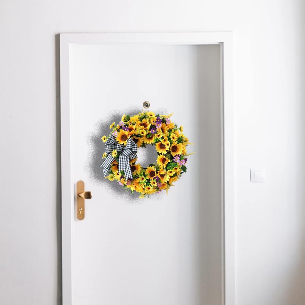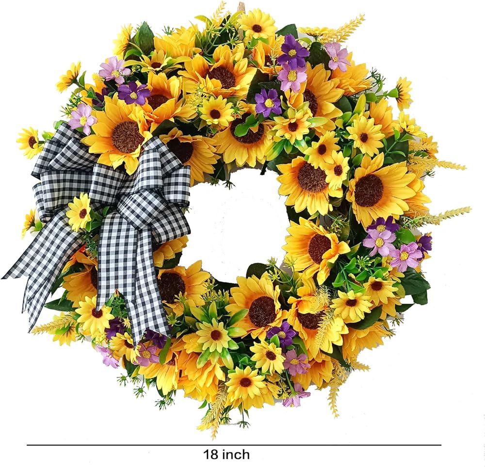 المظهر الطبيعي: إكليل عباد الشمس الجميل مزين بأقحوان صغيرة - جميع الزهور تبدو جميلة ومليئة بالحيوية. لون فاتح، مثالي لإضاءة أي غرفة، شعور ناعم ومريح، صلابة قوية.