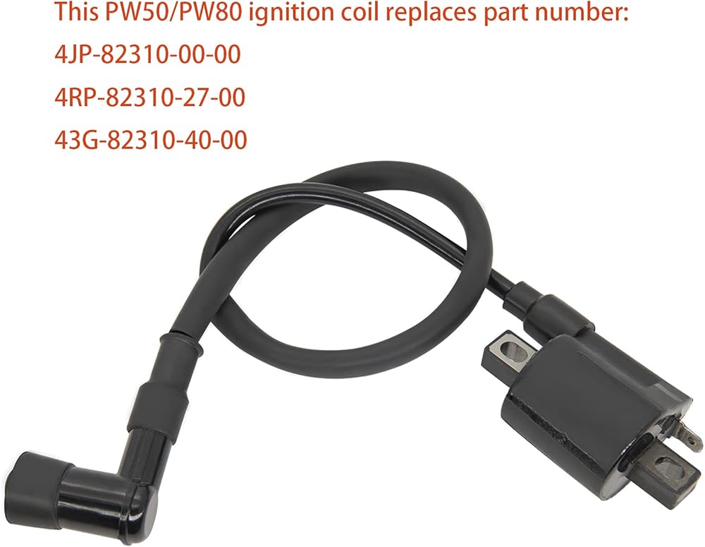 This PW80 Ignition Coil and A7TC Spark Plug 100 Percent brand new and high-quality, durable and good quality, high temperature resistance, strong high and low speed ignition performance. This PW50/PW80 Ignition Coil Replaces part number : 4JP-82310-00-00, 4RP-82310-27-00, 43G-82310-40-00.90 degree angle steel Cap with rubber bushing 5k ohm resistance, 57mm bolt spacing. High Performance Spark Plug A7TC with High Performance Three Electrode Head, Special Material of electrode, long life and Strong Spark, Gives Spark Three Paths To Follow, Specifically Designed To Boost Performance Of the Engine. This PW80 Ignition Coil and A7TC Spark Plug Compatible with Yamaha PW50 / PW 50 / PW-50 1981-2021, PW80 / PW80 / PW-80 1983 -2021. PW80 ignition coil Also known as Yamaha PW 80 ignition, PW-80 ignition, PW50 ignition, PW 50 ignition, PW-50 ignition. Package include : 1 x PW50/PW80 ignition coil 1 x A7TC Plug Spark