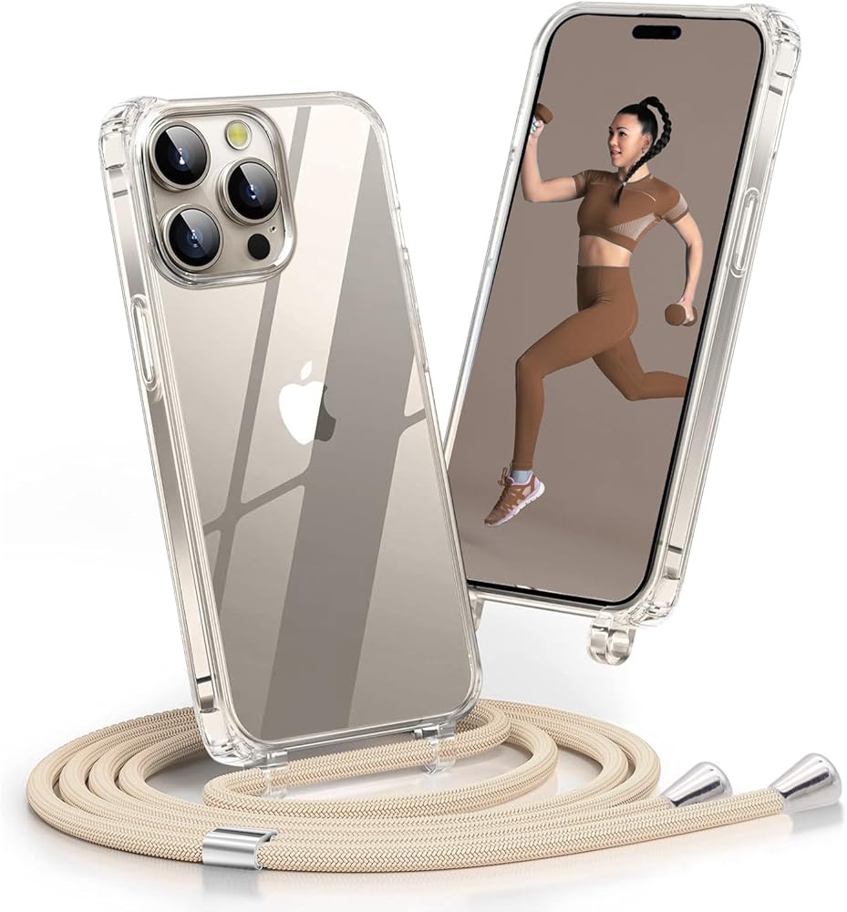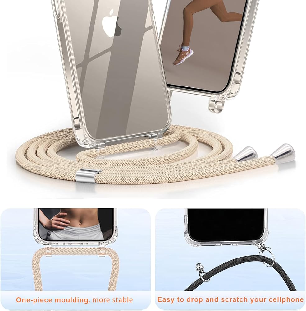 COBATREE Crossbody for iPhone 15 Case,Necklace Mobile Phone Cover with Cord Strap Adjustable Length Lanyard Rope Shockproof Hands-Free Clear Phone Cover for iPhone 15-Beige