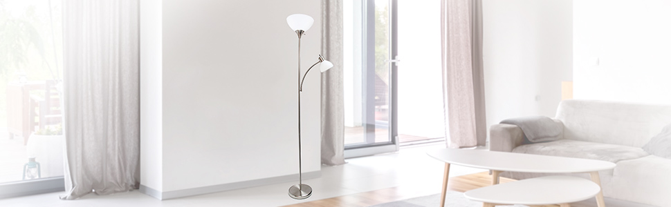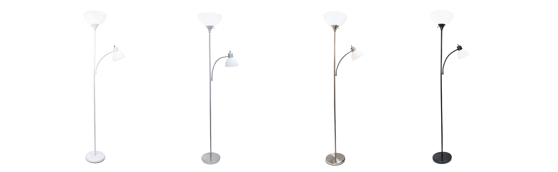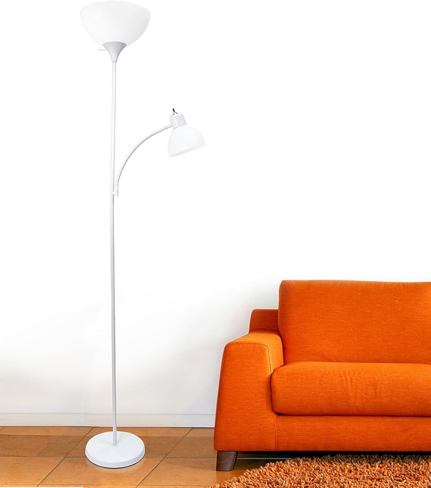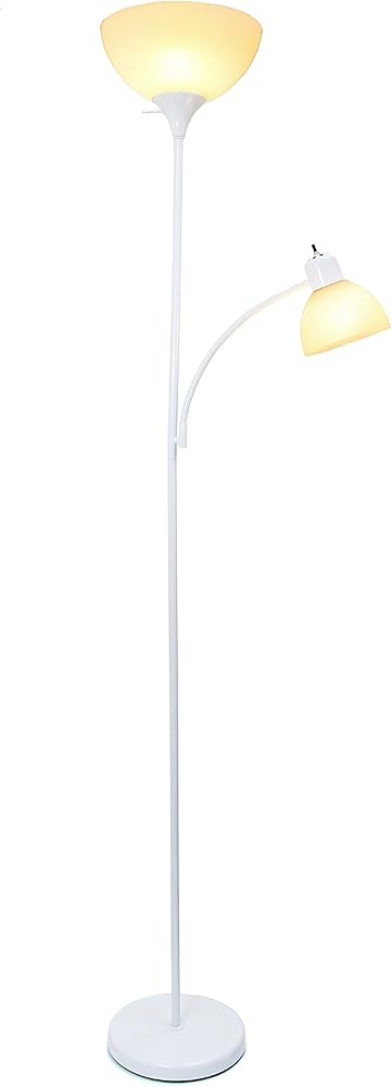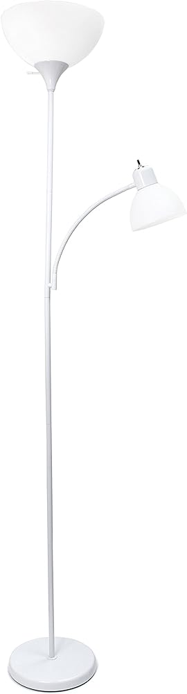 A charming, inexpensive, and practical floor lamp to meet your basic lighting needs. This simple mother/daughter floor lamp with reading light features a painted finish and plastic white shades. Perfect for living room, bedroom, office, kids room, or college dorm.