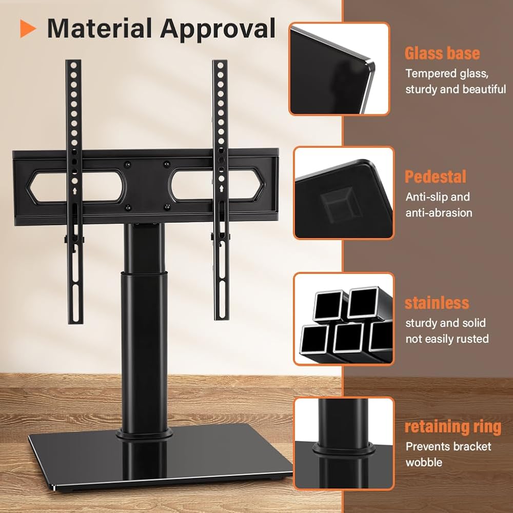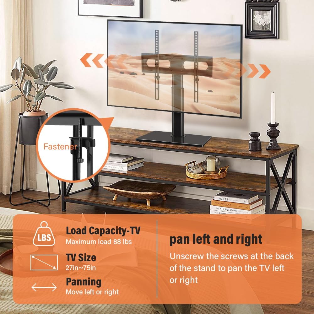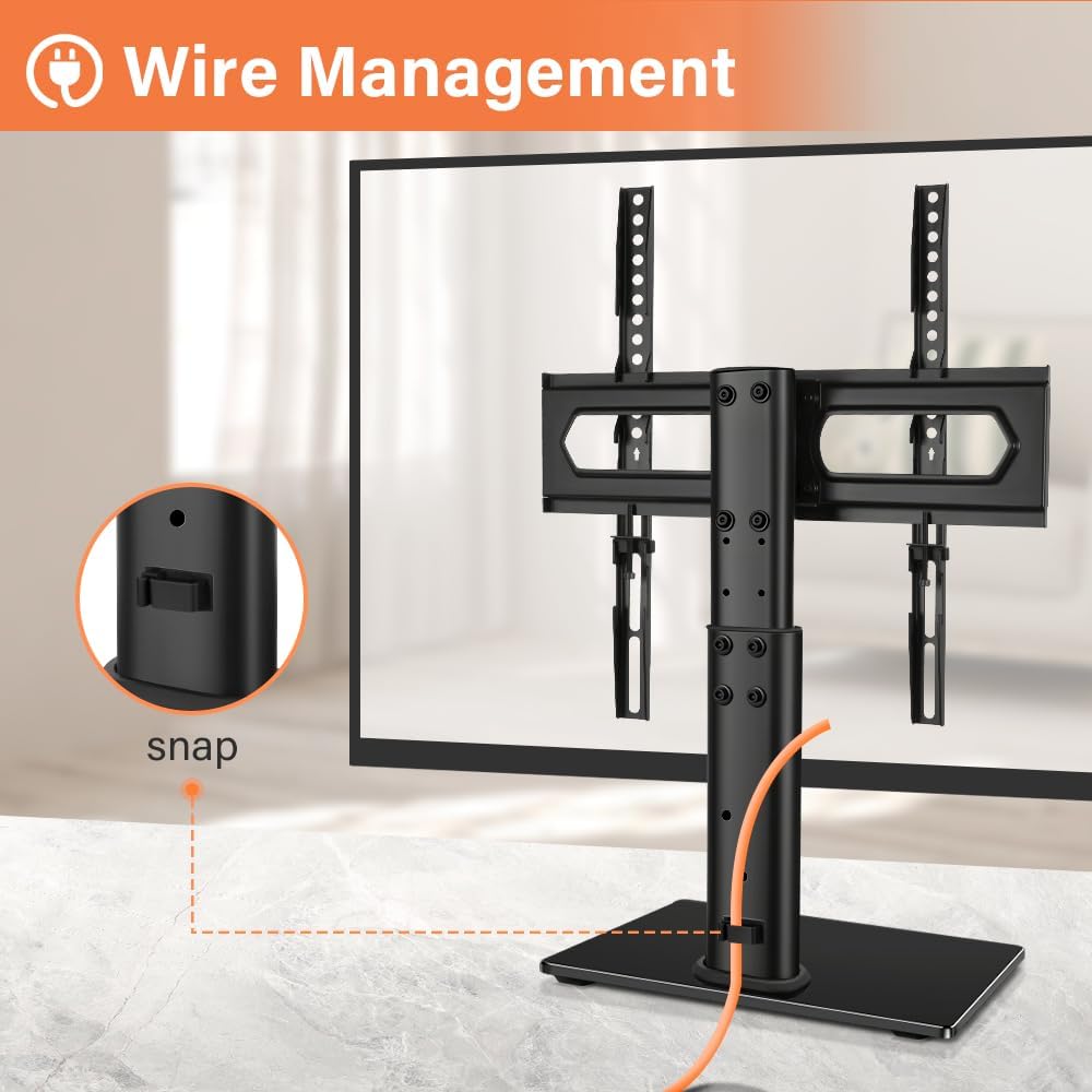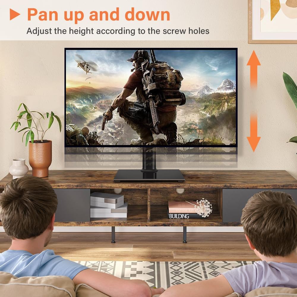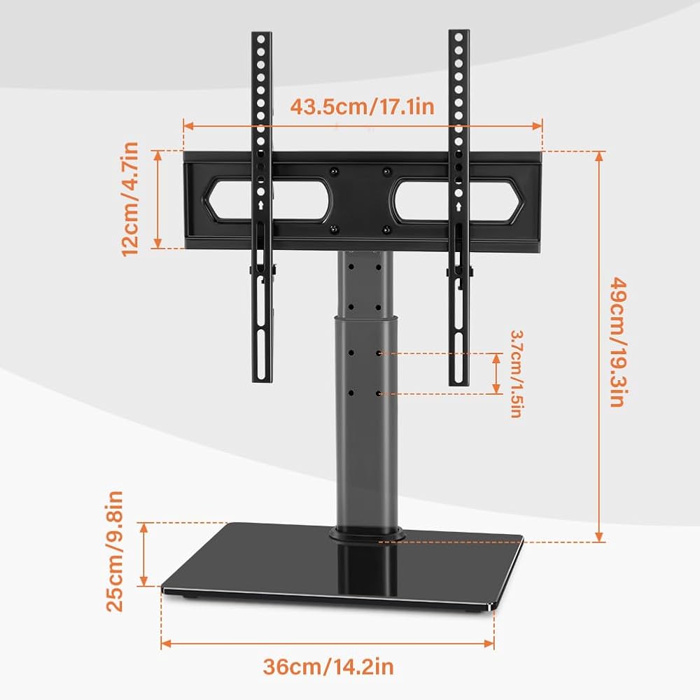 universal tabletop TV stand fits 27 to 60 inch TVs with VESA pattern from 100mmx100mm to 400mmx400mm, holds up to 88Lbs