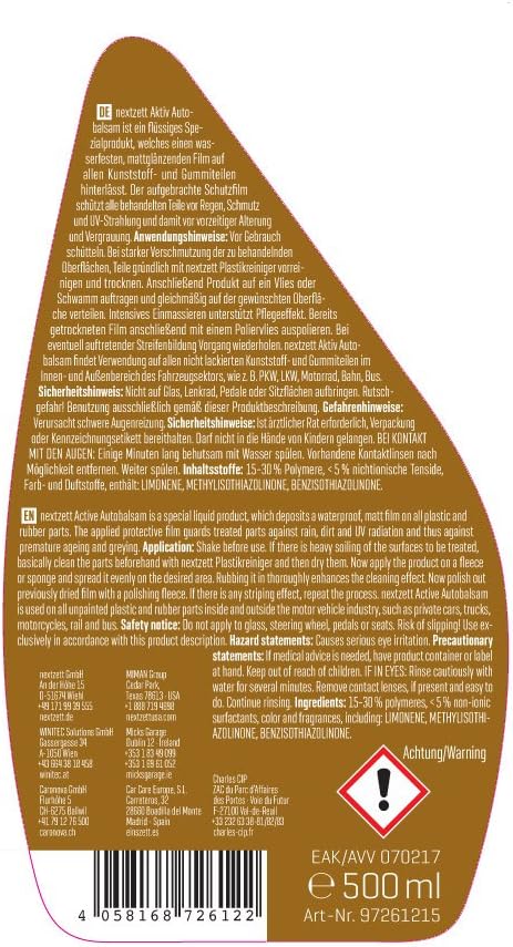 Vinyl-Rubber Extra "Aktiv Auto balsam" revives, enhances and protects exterior and interior plastic, vinyl and rubber surfaces such as tires, plastic trim and tonneau covers with a low shine, weather and dust resistant finish. VRE protects surfaces from fading from the sun's ultraviolet rays and heat and restores faded surfaces to like-new condition. Cleans light dirt while deep penetrating conditioning oils recondition to prevent drying and cracking due to the effects of heat, sun, weather and pollution. VRE applies a weather and dust resistant seal ensuring protectants remain for long-lasting protection and appearance.