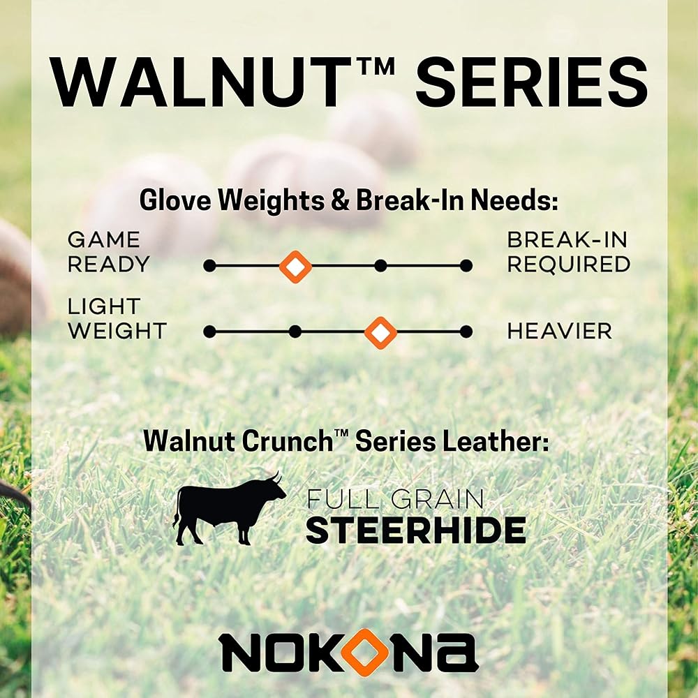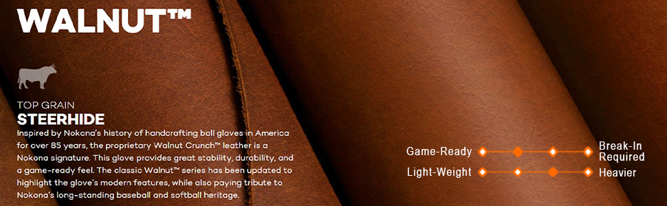 Inspired by Nokona's history of handcrafting ball gloves in America for over 85 years, the proprietary Walnut Crunch leather is a Nokona signature. This glove provides great stability, durability, and a game-ready feel. The classic Walnut series has been updated to highlight the glove's modern features, while also paying tribute to Nokona's long-standing baseball and softball heritage. Since 1934, in Nocona, Texas, premium Nokona ball gloves have been handcrafted by skilled American workers, using the world's highest quality leathers. Nokona gloves are individually cut, stamped, stitched, laced, and embroidered, which gives each one its own unique identity and feel. Today, Nokona is focused on the future, applying many of the same principles that have guided our past – quality, craftsmanship, innovation, integrity, and a commitment to our employees, suppliers, customers, and our country. We continue to put classic American workmanship into every glove, using techniques developed over the past 85+ years.