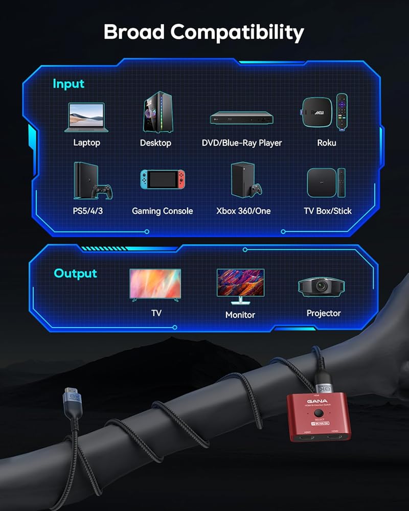 【مفتاح HDMI ثنائي الاتجاه】 يمكن لمحول HDMI توصيل مصدرين للإشارة (PS5، Xbox Series X) بسلاسة إلى شاشة واحدة، أو مصدر إشارة واحد إلى شاشتين (لا يمكن العرض في وقت واحد). يساعد على توسيع منافذ HDMI 2.1 على جهاز التلفزيون الخاص بك. من السهل التبديل عن طريق الضغط على زر التبديل. لا حاجة لتوصيل وفصل الكابلات.