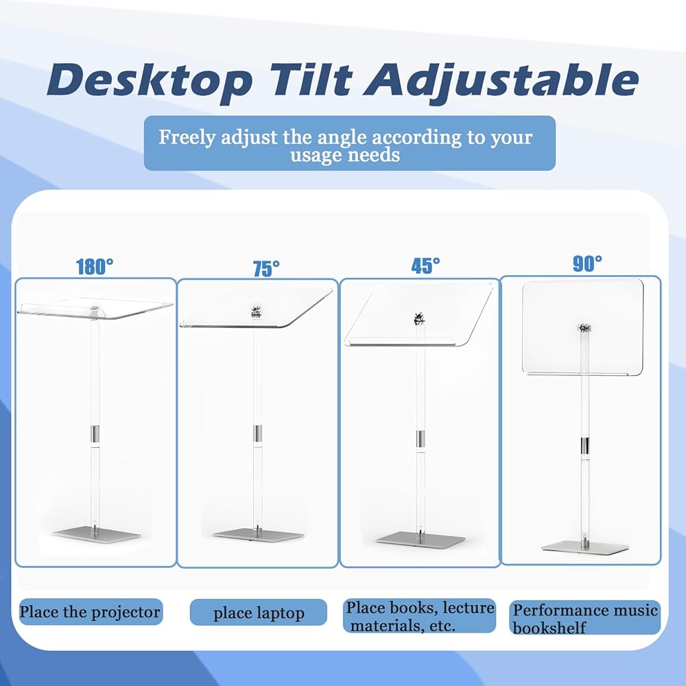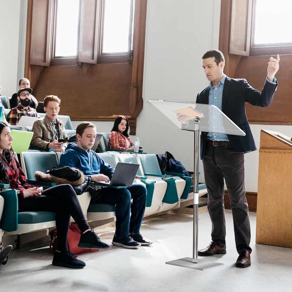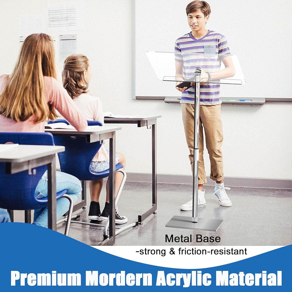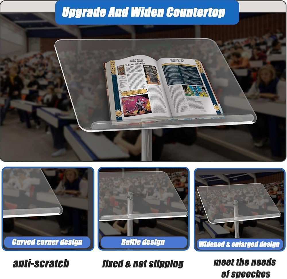 • حاملات الأكواب ورفوف تخزين البيانات: تم تصميم المنصة الأكريليكية مع رفين وسطيين. يقوم رف التخزين العلوي بتخزين أكوابك وهواتفك المحمولة وغيرها من الأغراض الشخصية، بينما يقوم الرف السفلي المائل بتخزين مواد المحاضرات والكتب الخاصة بك. التصميم المدروس يجعله مثاليًا لجميع احتياجات العرض التقديمي الخاص بك.