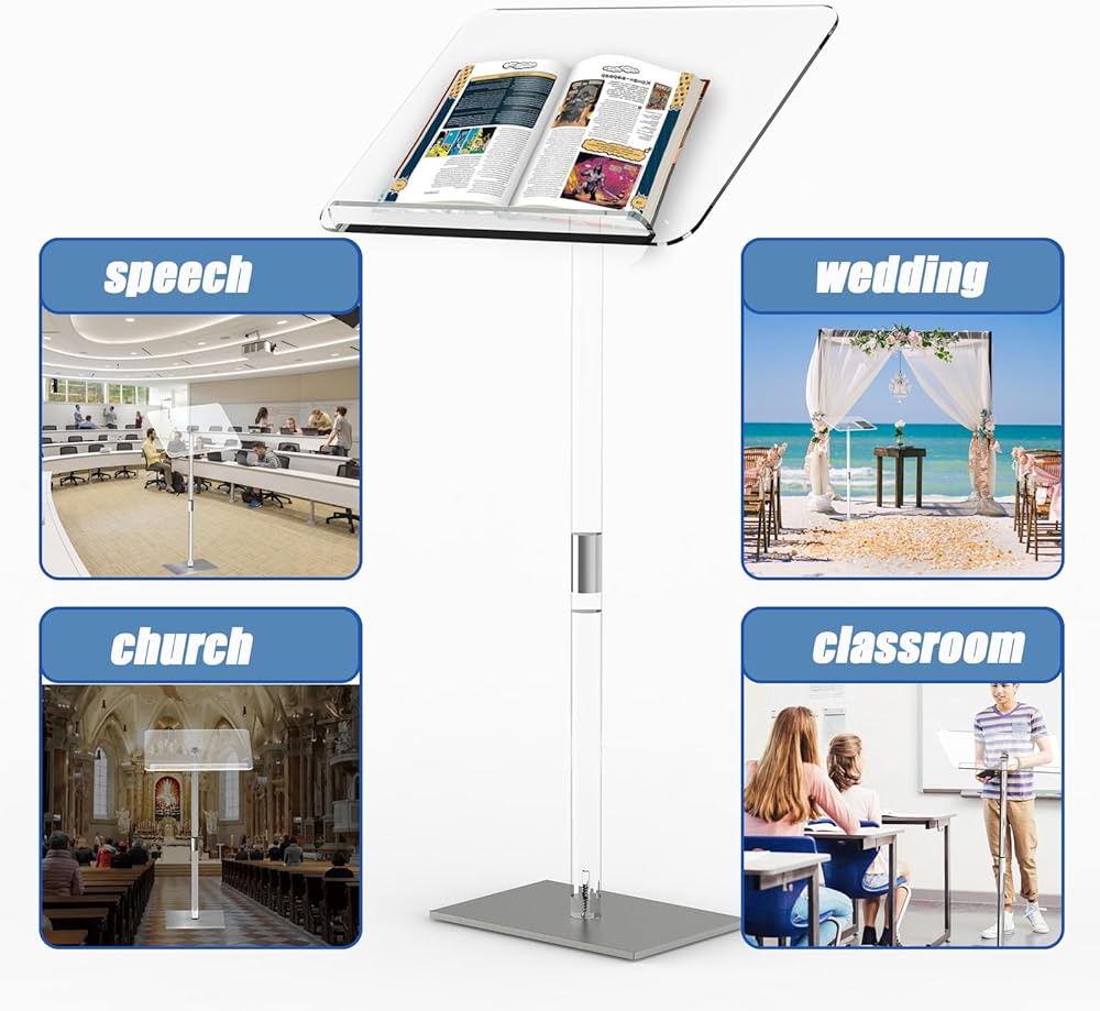 • الاستخدام متعدد الوظائف: يمكن استخدام المظهر الأنيق والتصميم الاحترافي لمنبر الأكريليك كمنصة كنيسة، ومنصة استقبال رأسية، ومنصة زفاف، ومنصة للفصول الدراسية، والندوة، والمؤتمر الصحفي، وصراف مركز التسوق وغيرها من أماكن التحدث العامة.