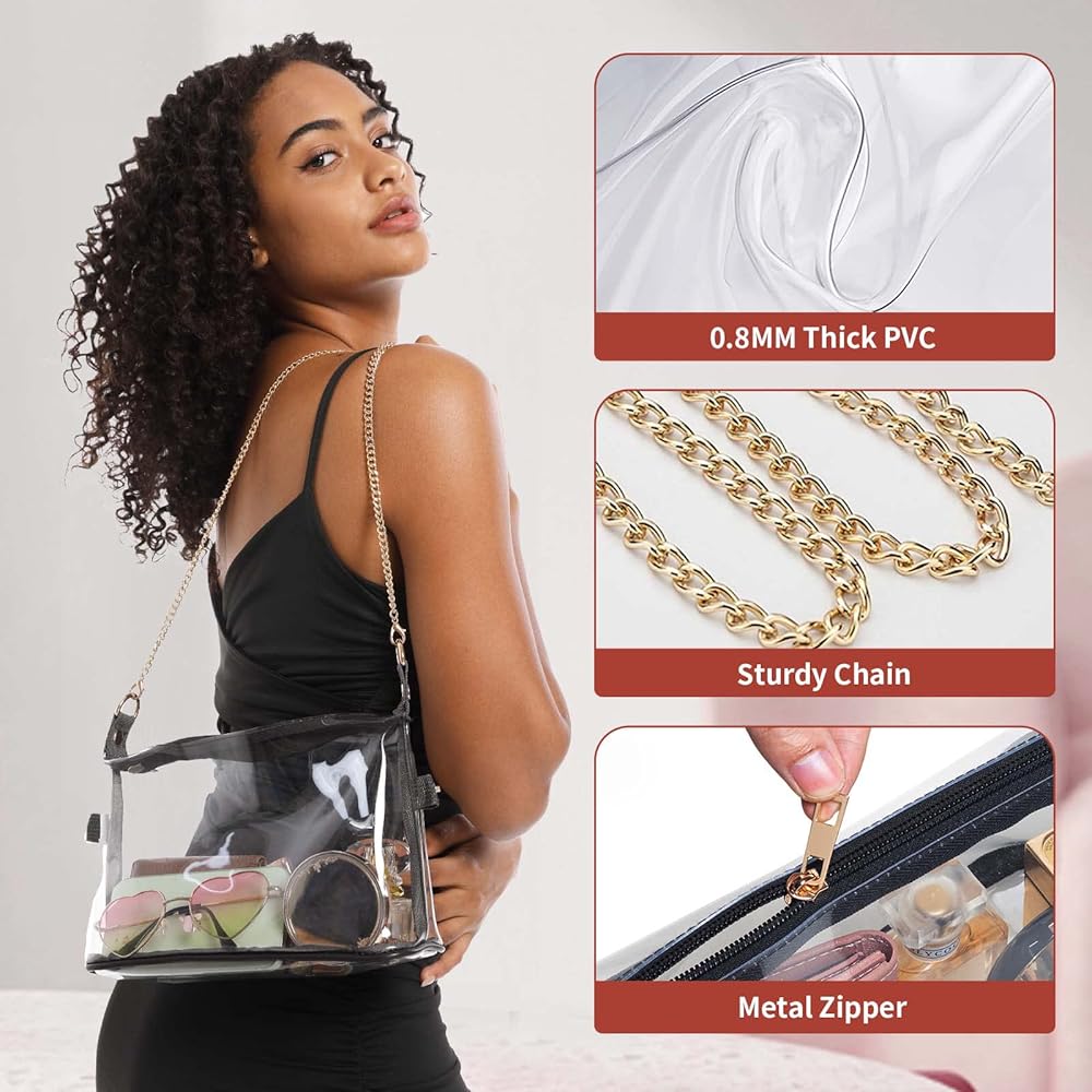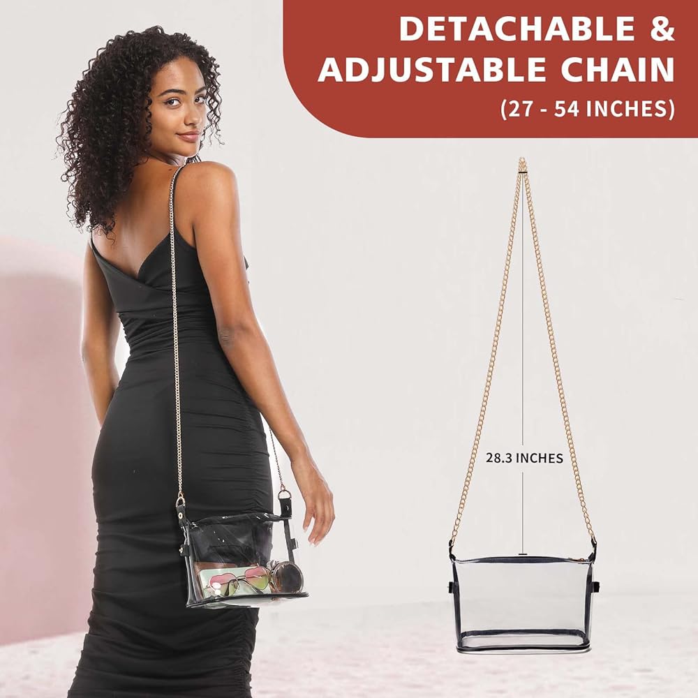 سلسلة قابلة للتعديل والفصل: حزام حقيبة الحفلات الموسيقية الشفافة مصنوع من سلسلة معدنية قوية، والتي يمكن تعديلها وفصلها لتناسب شكل جسمك وتفضيلاتك. من خلال تغيير طول الحزام، يمكنك استخدام المحفظة الشفافة كحقيبة كتف شفافة، أو حقيبة كروس شفافة، أو حقيبة تحت الإبط.
