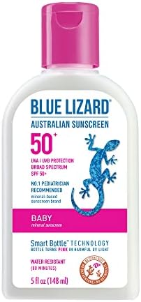 واقي شمسي معدني بيبي من بلو ليزارد مع أكسيد الزنك، عامل الوقاية من أشعة الشمس بدرجة 50+، مقاوم للماء، حماية من الأشعة فوق البنفسجية فئة A وB مع تقنية الزجاجات الذكية - خالٍ من العطور، 150 مل