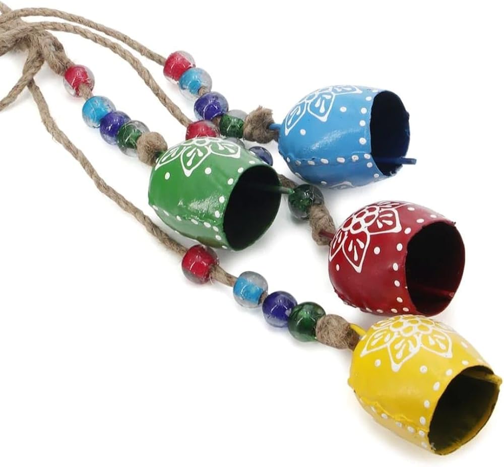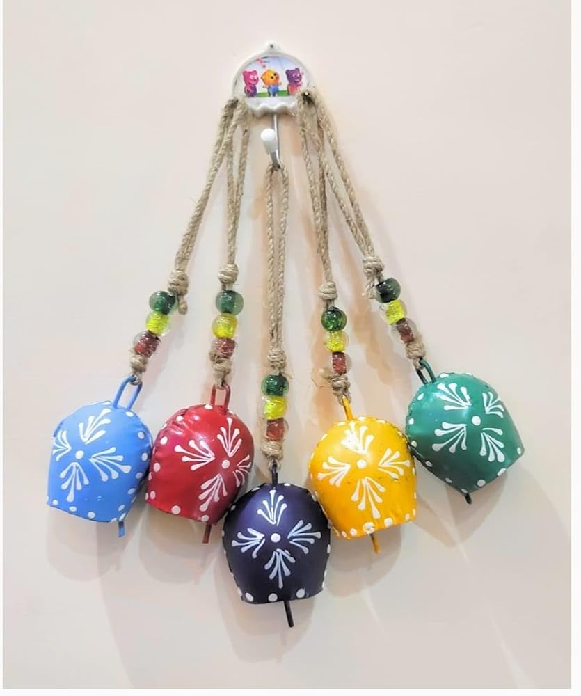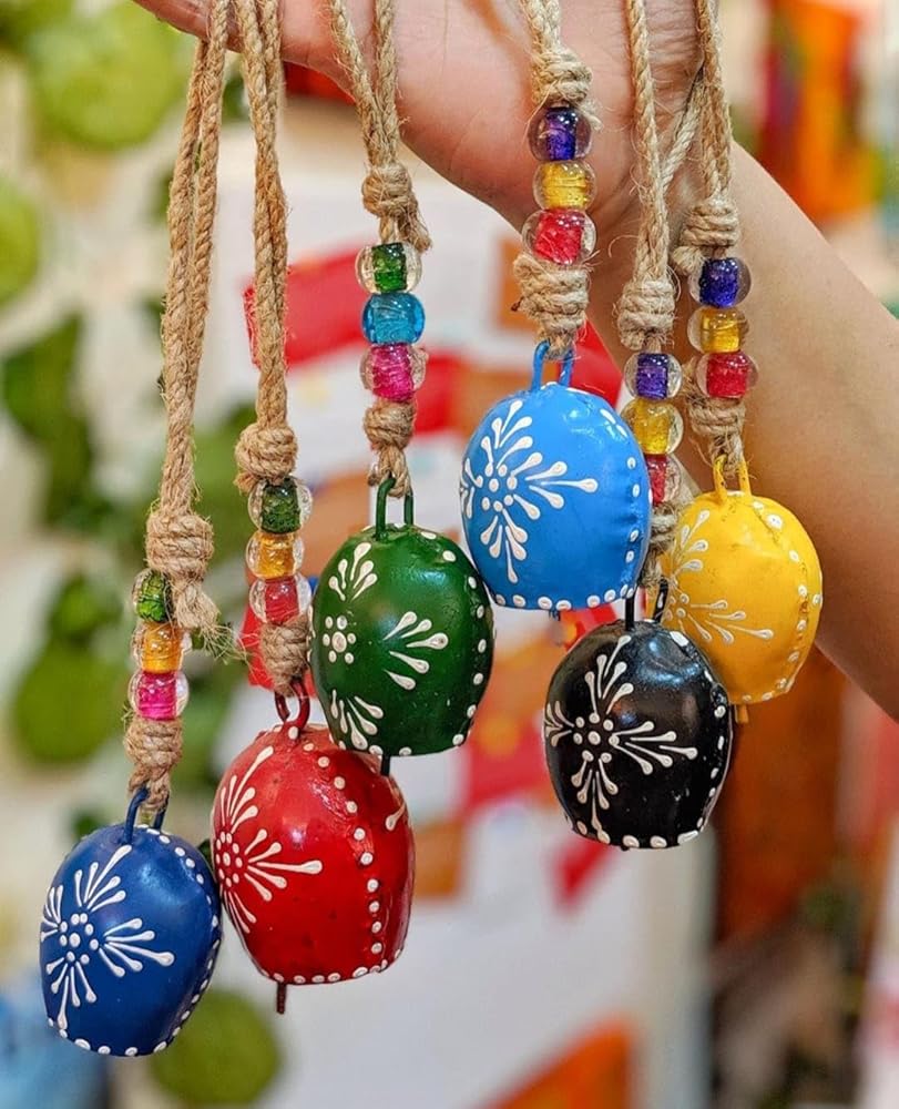 Tin Metal Cow Bells: Size – 7 Cm With Rope – 20 Cm: Bell Type – Hand Printed Bell: Pack of - 5 Pcs Bell with rope. Occasion & Festival: Easter, Christmas, Earth Day, Anniversary, Wedding and Engagement, Thank You and Appreciation, Gift