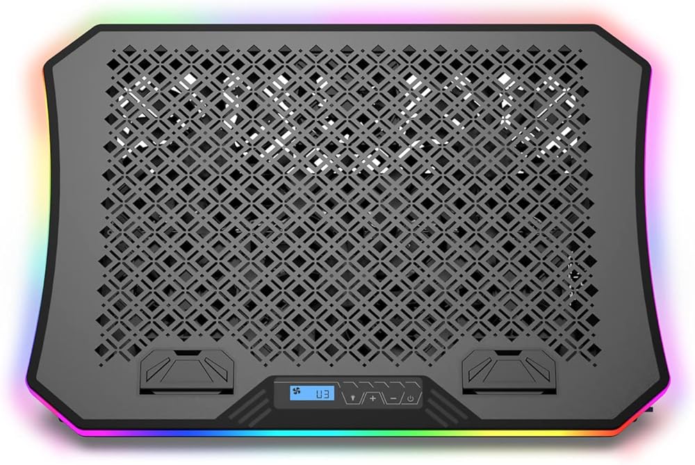 لوحة تبريد الكمبيوتر المحمول USB المريحة من Aluratek مع مصابيح RGB (10 أنماط)، 3 مراوح هادئة، هاتف ذكي، محمول، ارتفاع قابل للتعديل، يدعم أجهزة كمبيوتر محمولة تصل إلى 19 بوصة (ACPRGB01F)، أسود