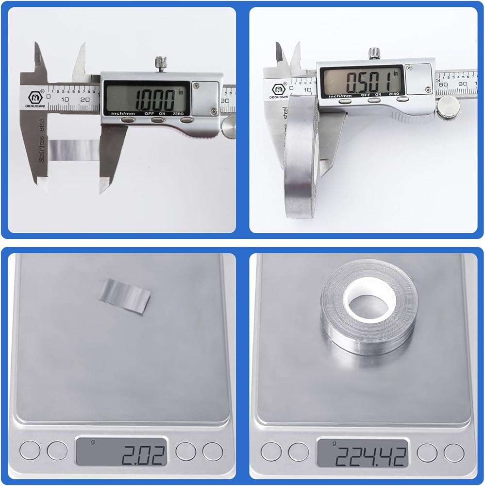 الحجم والوزن: يبلغ قياس شريط الرصاص اللاصق حوالي 1/2 بوصة × 100 بوصة (1.27 × 254 سم)، 2 جرام لكل بوصة. سيوفر التوازن المثالي لمجداف كرة البيسبول والتنس والجولف.