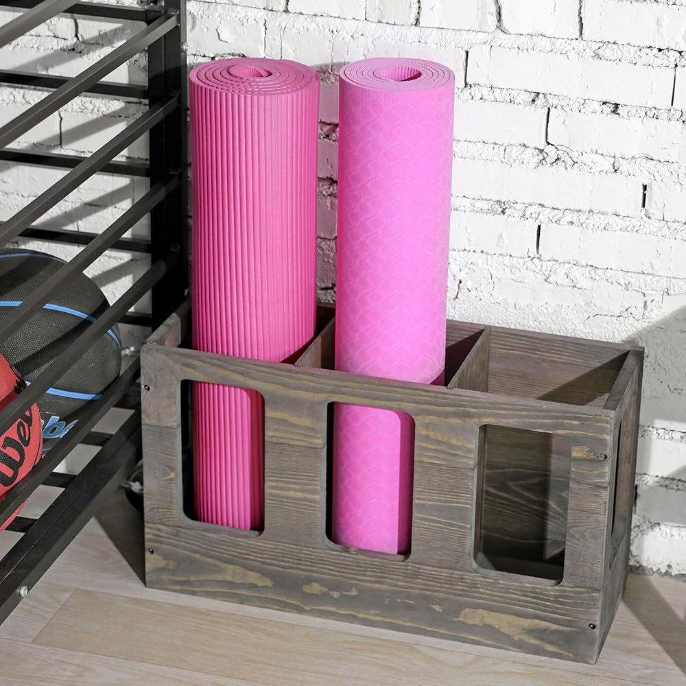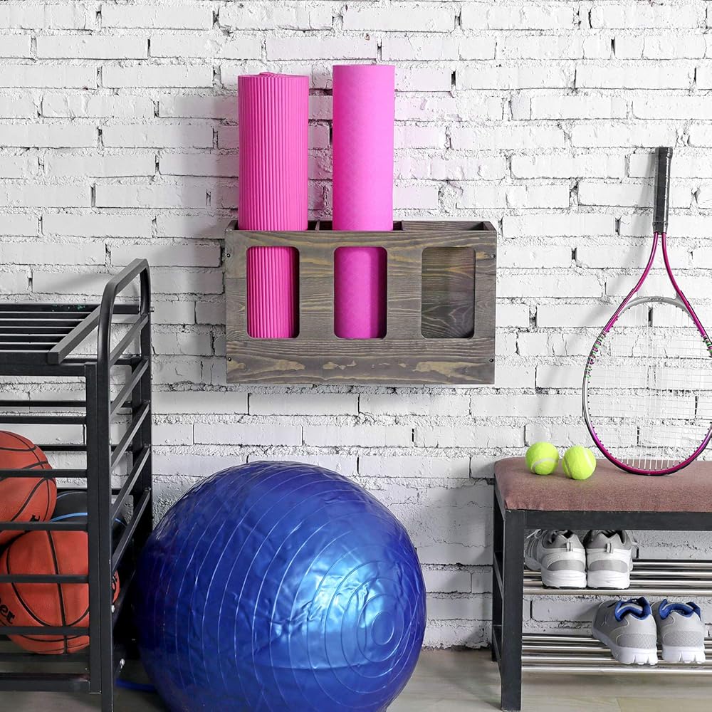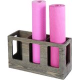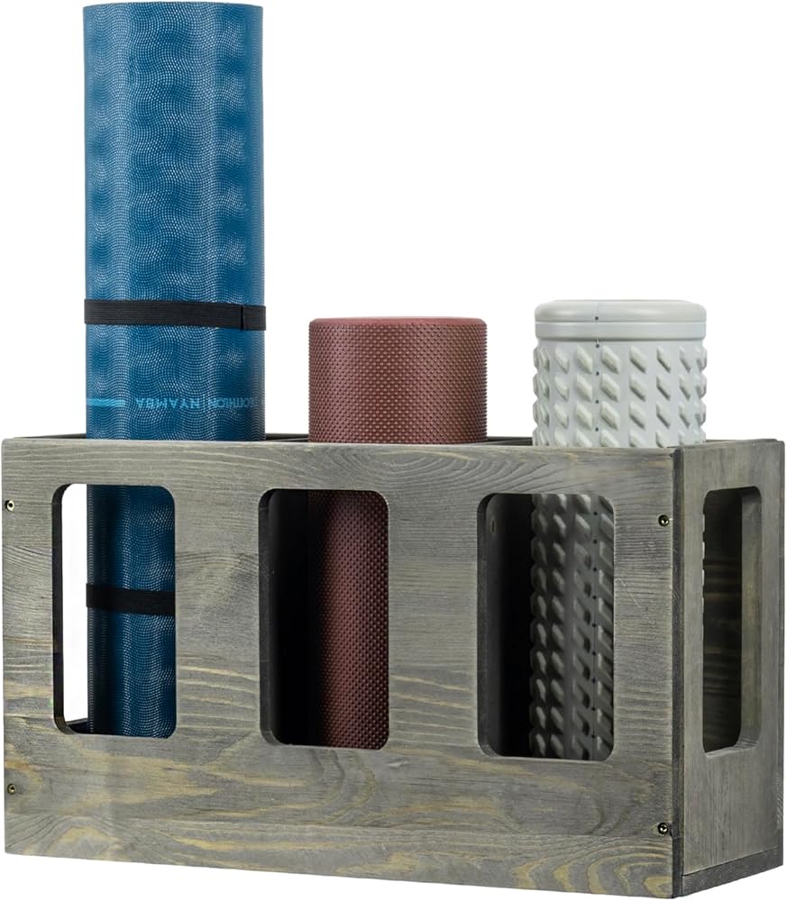 Keep your foam rollers easily accessible and add a touch of country style to your home gym or fitness center with this vintage gray wood storage rack. Whether mounted to flat wall surfaces with proper hardware (Mounting hardware not included) or displayed on the floor, this foam roller organizer rack provides 3 compartments for storing foam rollers, yoga mats or even towels up to 6.25 inches in diameter and features open panels on the sides for an optimal view of their contents, creating a stylish storage solution for all your fitness equipment.