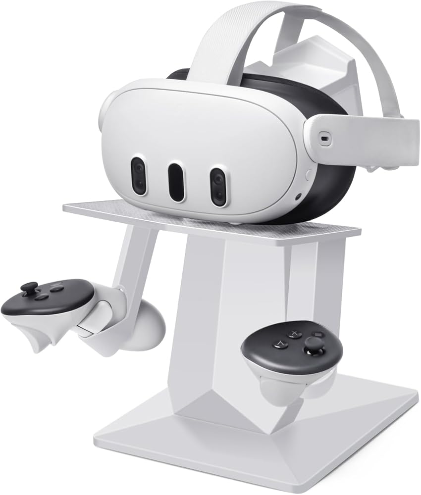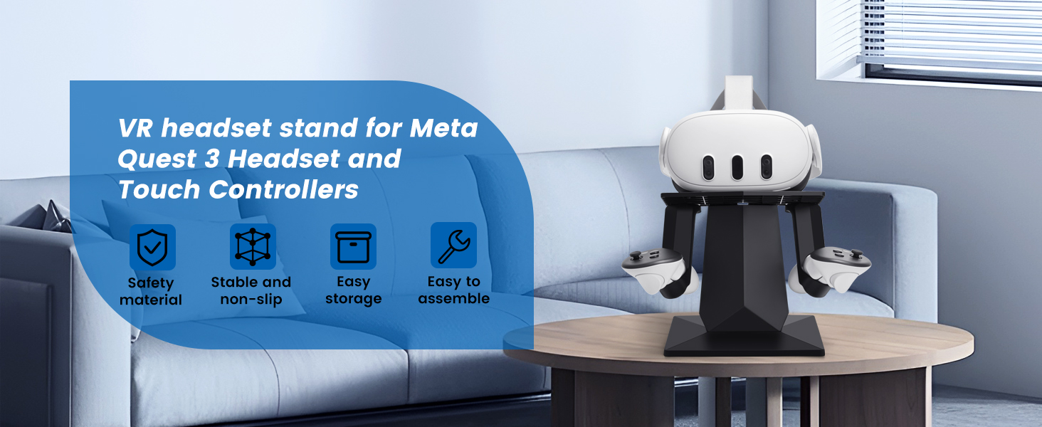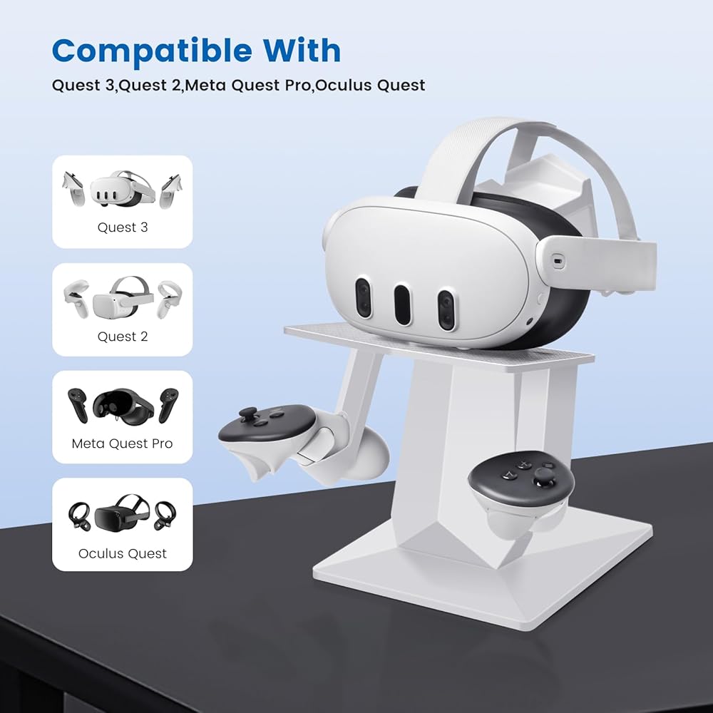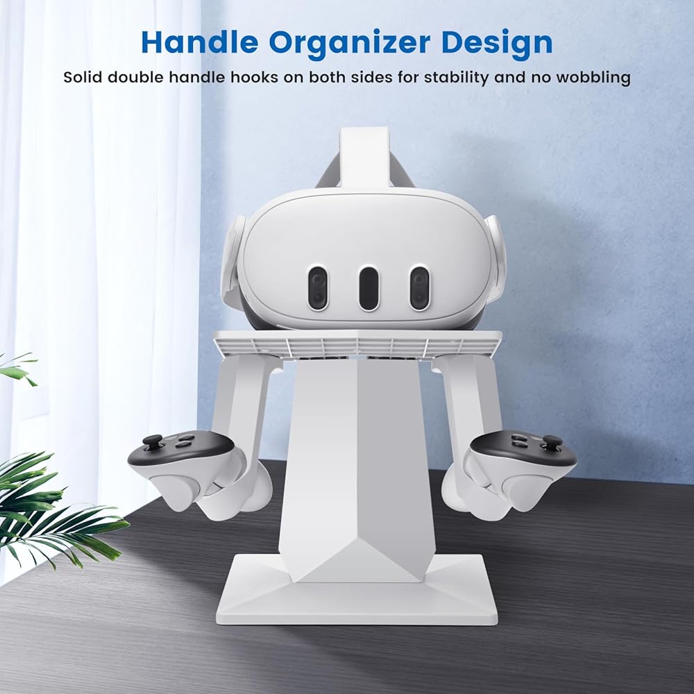 ➤[حماية معززة] يتم إمالة صينية سماعة الرأس بزاوية معينة مع سطح المكتب لجعل مركز الجاذبية متوازنًا بشكل أفضل ولن يهتز الحامل، مما يوفر حماية أفضل لسماعات الرأس Quest 3/Quest 2 VR. (ملاحظة: ملحق مقبض السيليكون يجب إزالتها.)